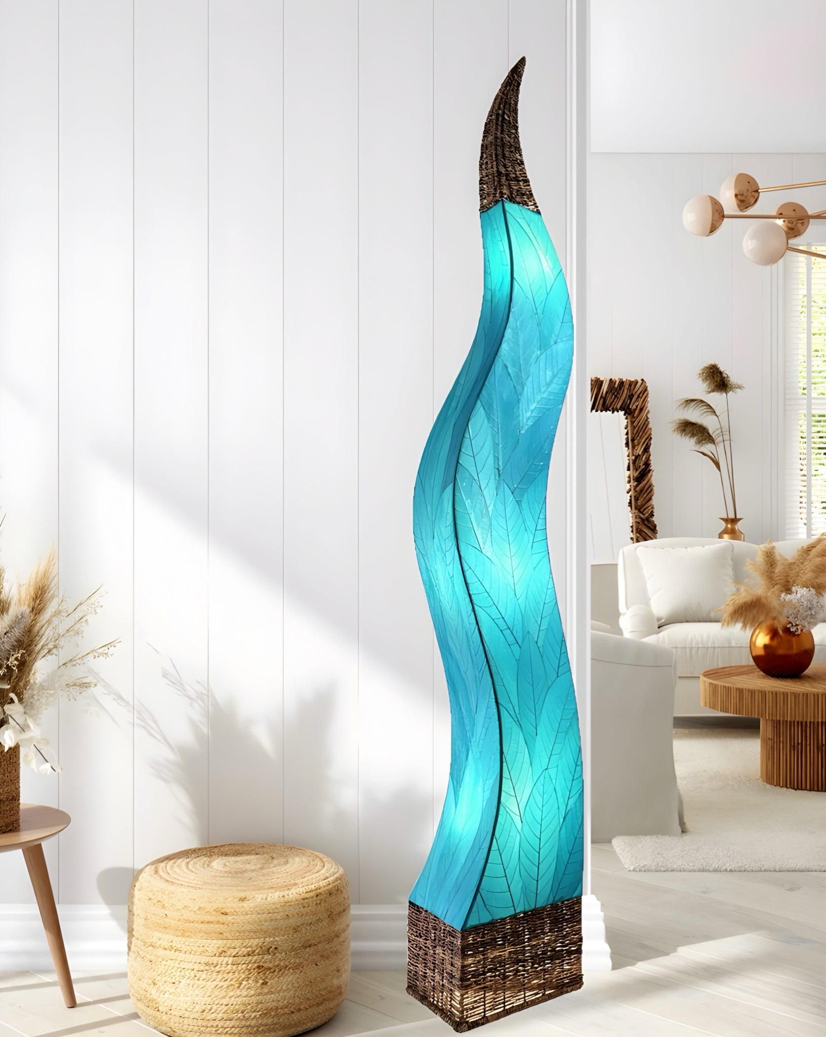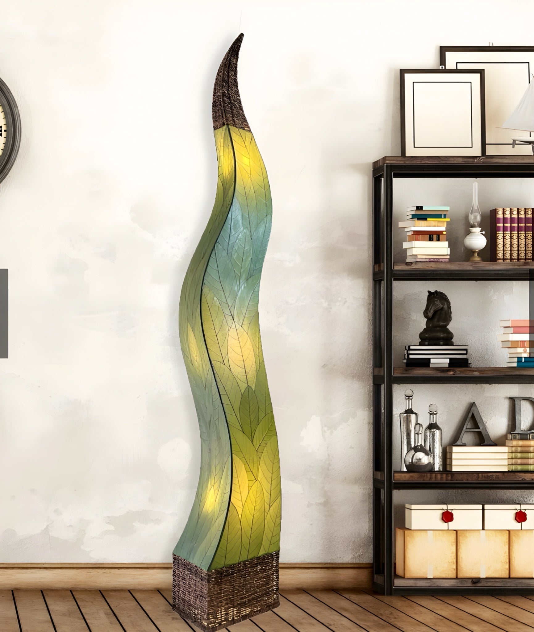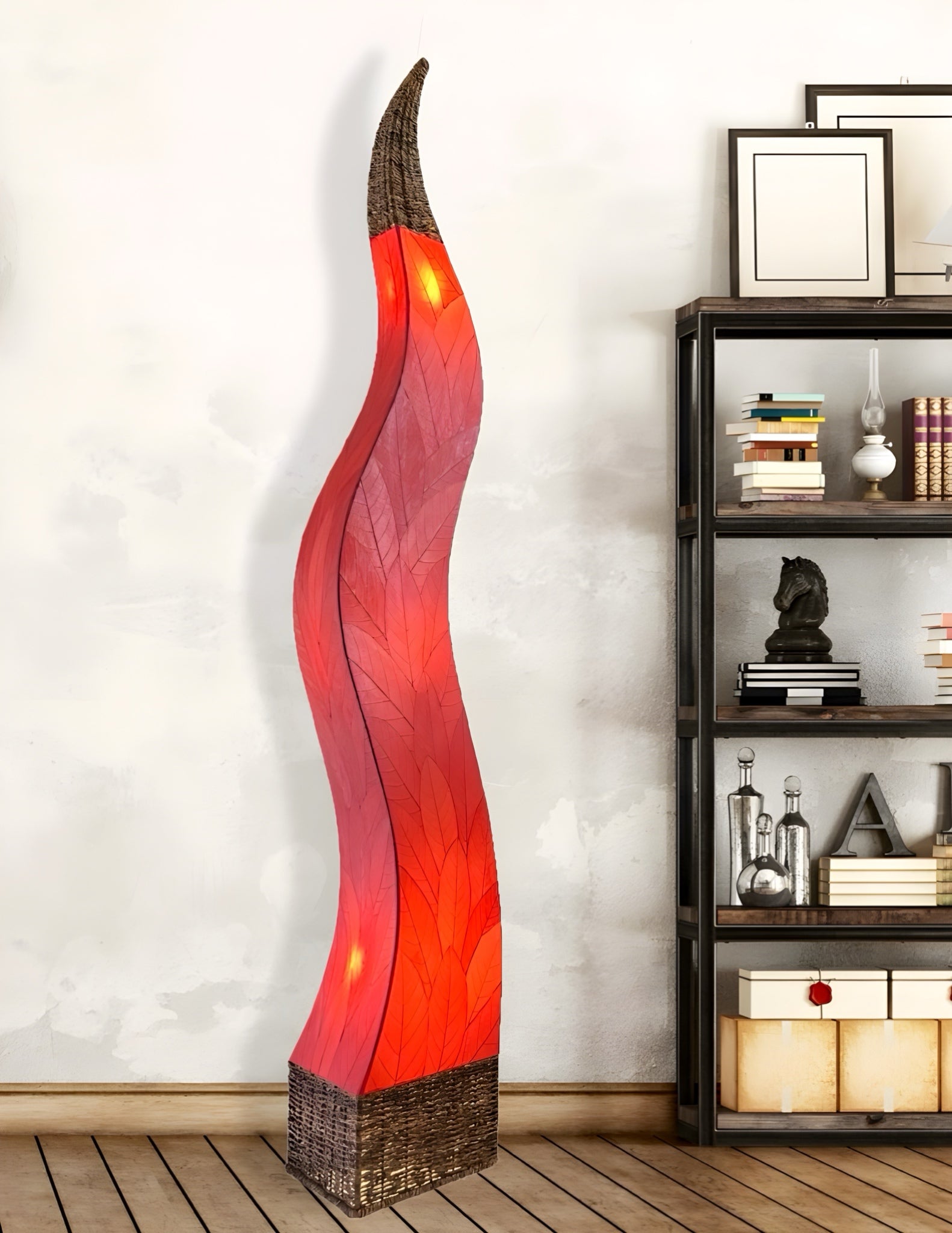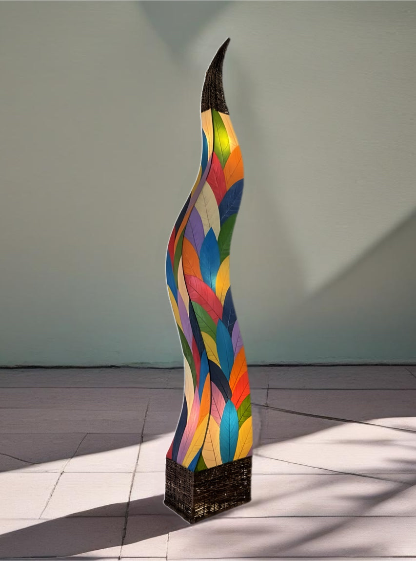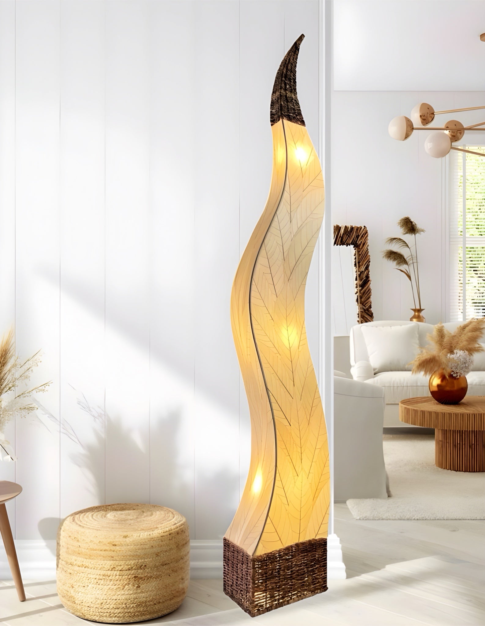The Giant Flame Lamp is inspired by the power and beauty of fire. The importance of the flame has been understood for centuries. The handwoven abaca rope, with its different hues of brown, represents firewood, which was the base material used for warmth and lighting, protection from predators, and a method of cooking food. The intriguing shape of the Flame Lamp, as it dances from left to right and from wide to narrow, is the fire’s flame. It is textured and colored by hand placing real, non-toxic dyed, cocoa leaves on the shade. Both the leaves and abaca are sourced using fair trade practices in the Philippines. Finally, the tip of the lamp is accented by abaca rope, this time, representing the smoke that escapes the heat. Humankind was able to advance, innovate, and civilize through harnessing fire. Continue the tradition by lighting up any room with the inspiring presence of the Flame Lamp.