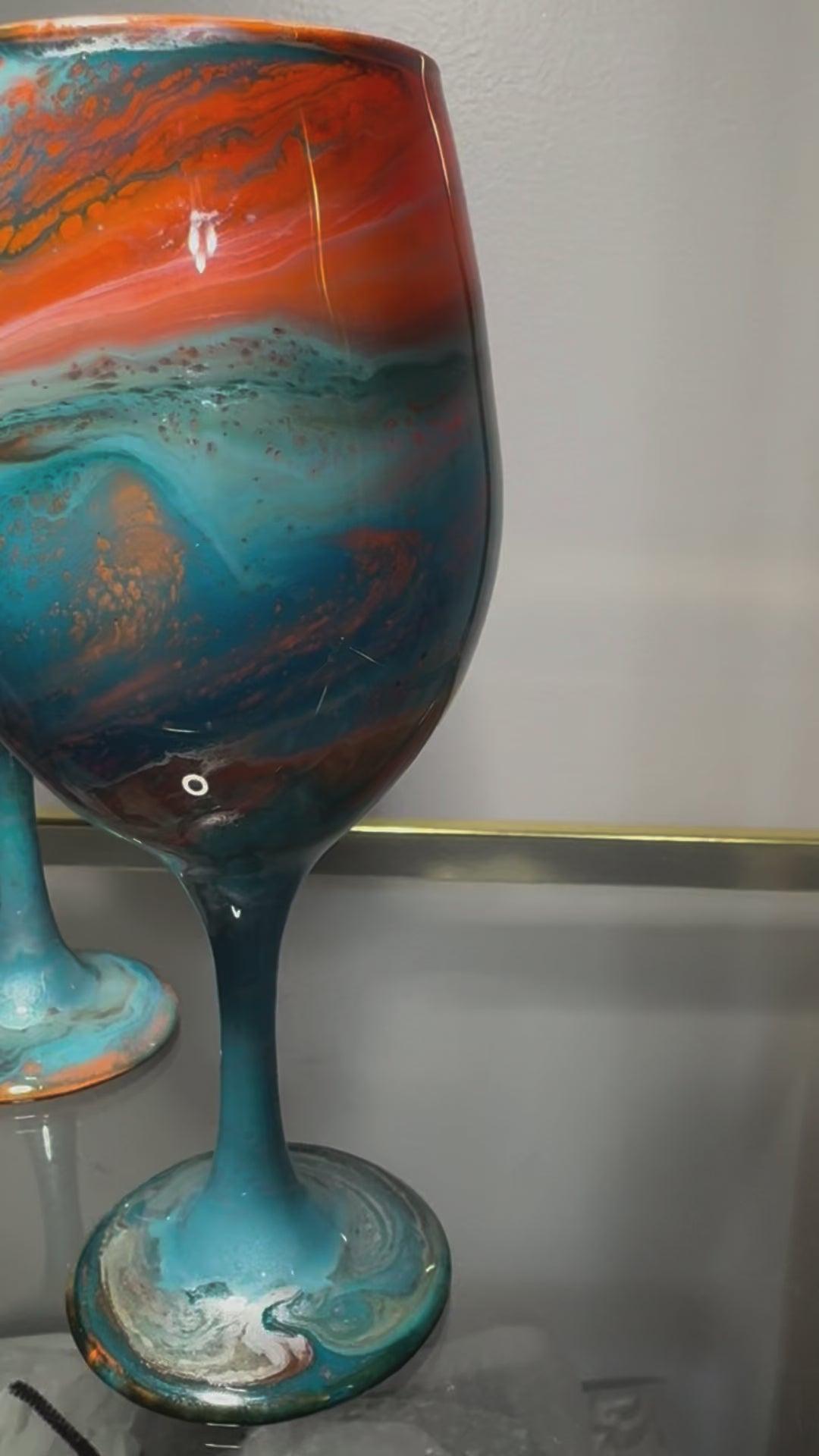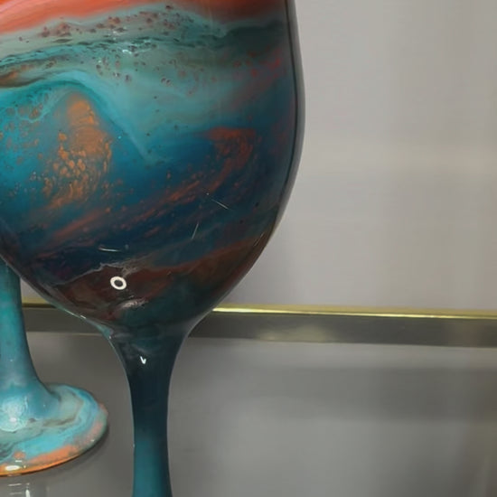 Each glass is individually hand-painted using various alcohol inks, mica or pigment pastes. No two glasses will be exactly alike. Glasses are made to order, so yours will look very similar to the glasses pictured, but indeed one-of-a-kind.