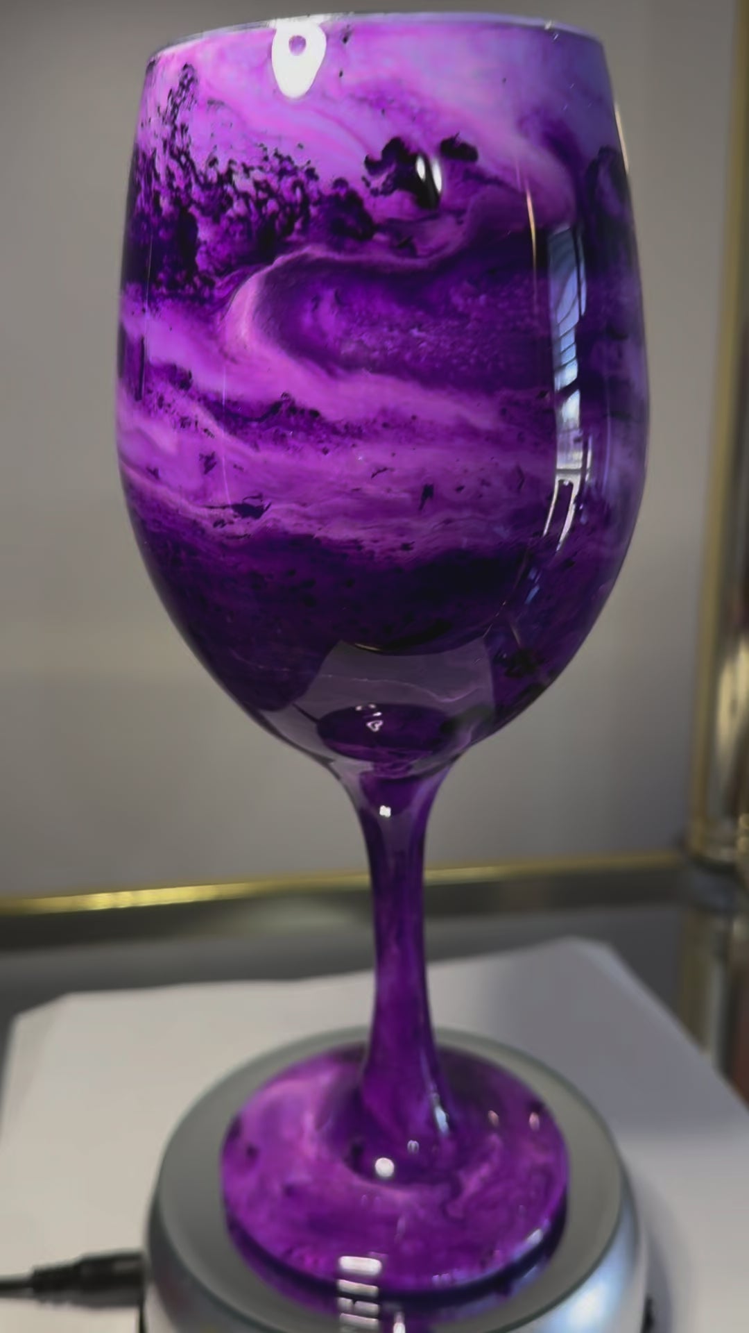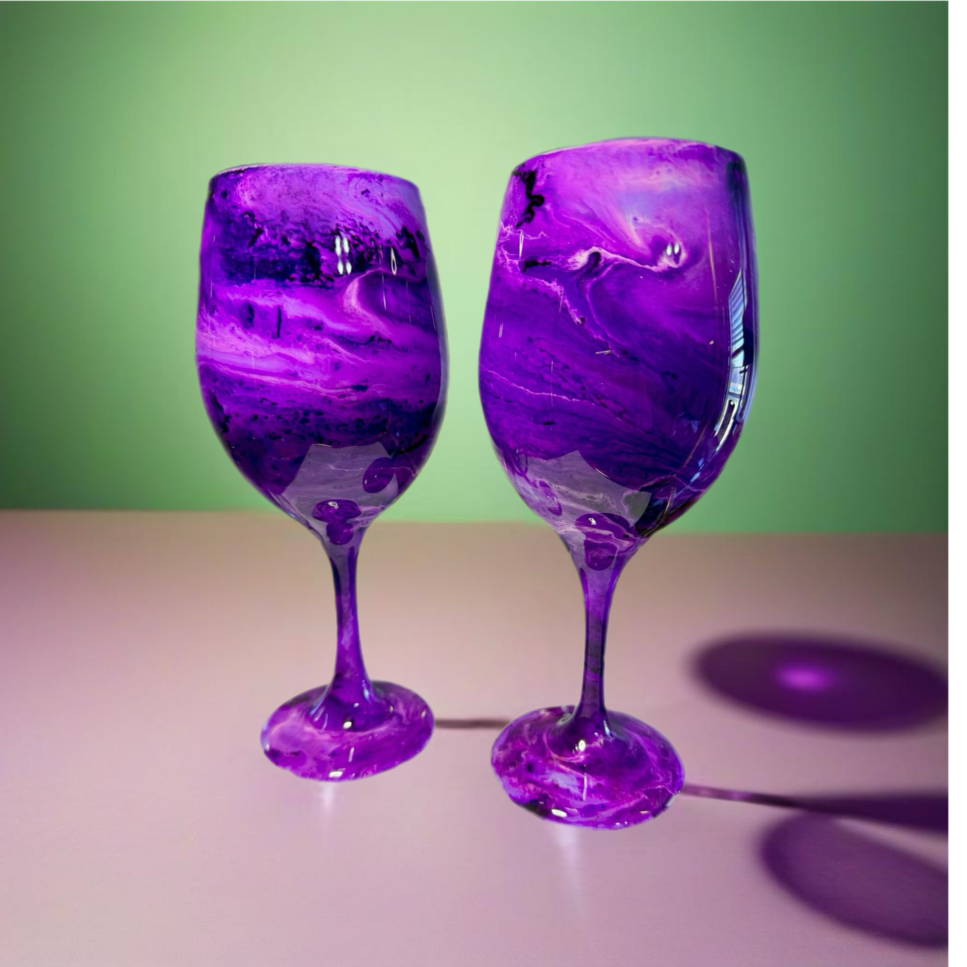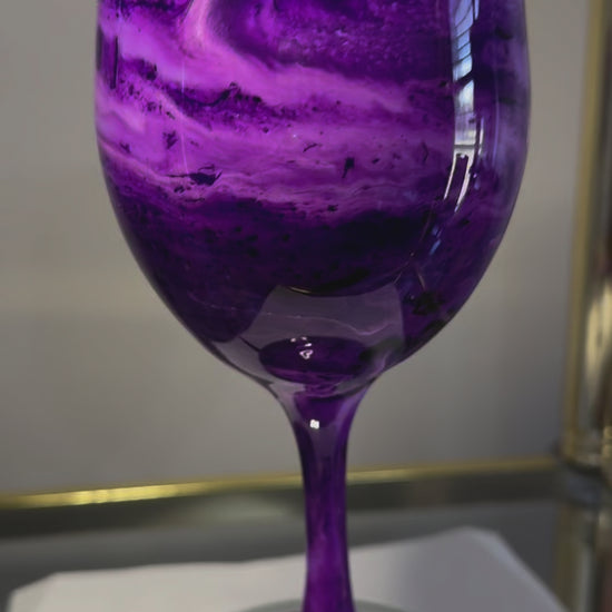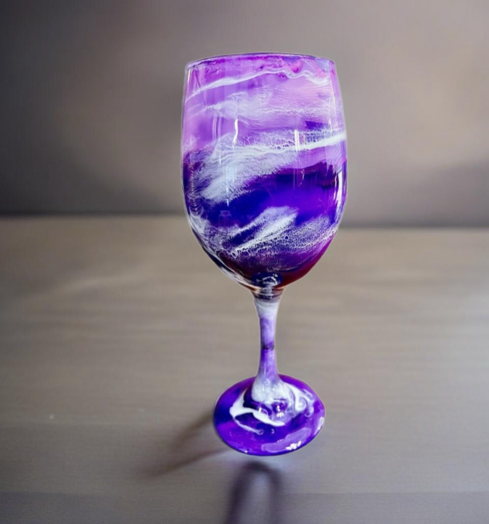 Each glass is individually hand-painted using various alcohol inks, mica or pigment pastes. No two glasses will be exactly alike. Glasses are made to order, so yours will look very similar to the glasses pictured, but indeed one-of-a-kind.