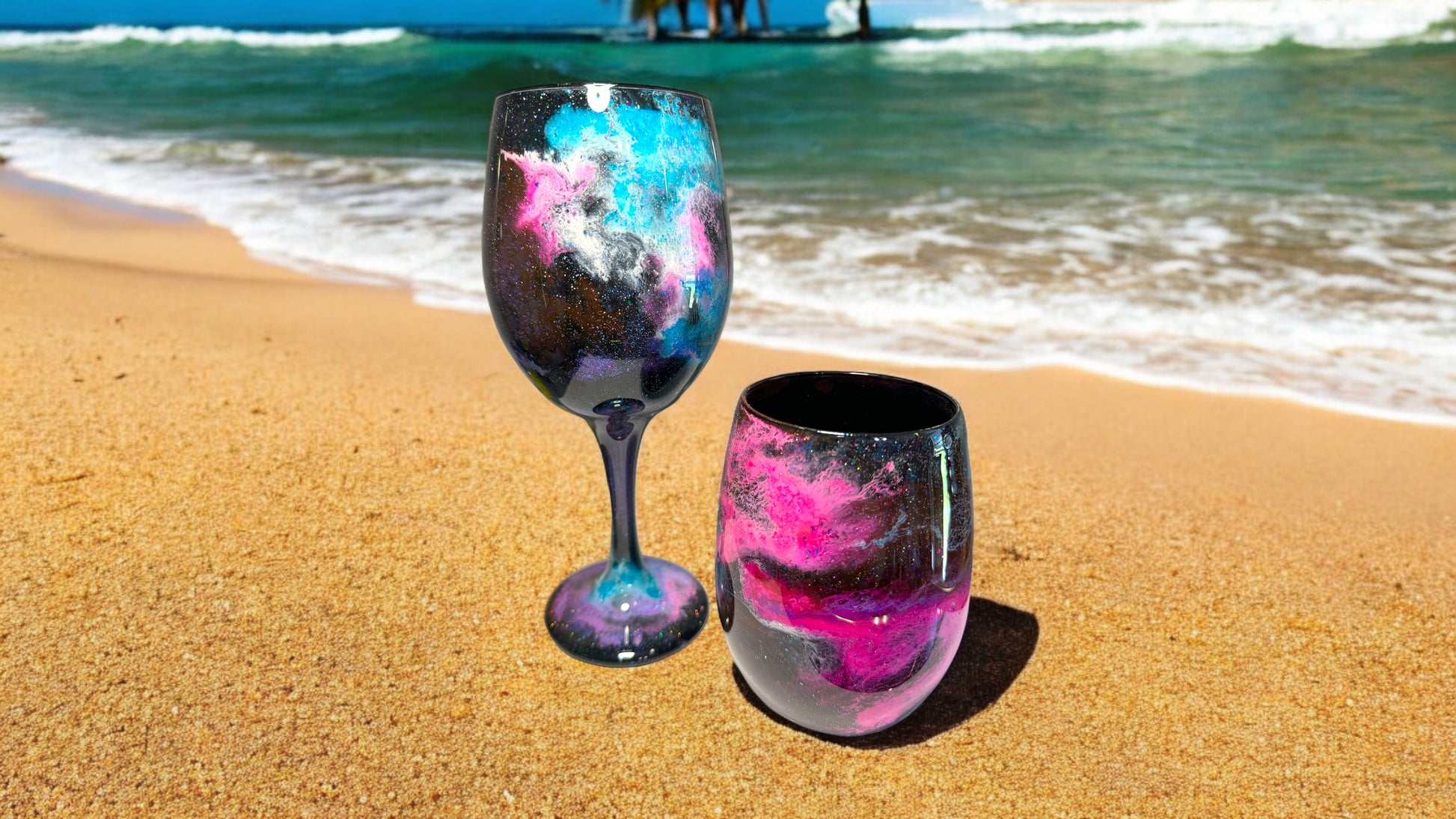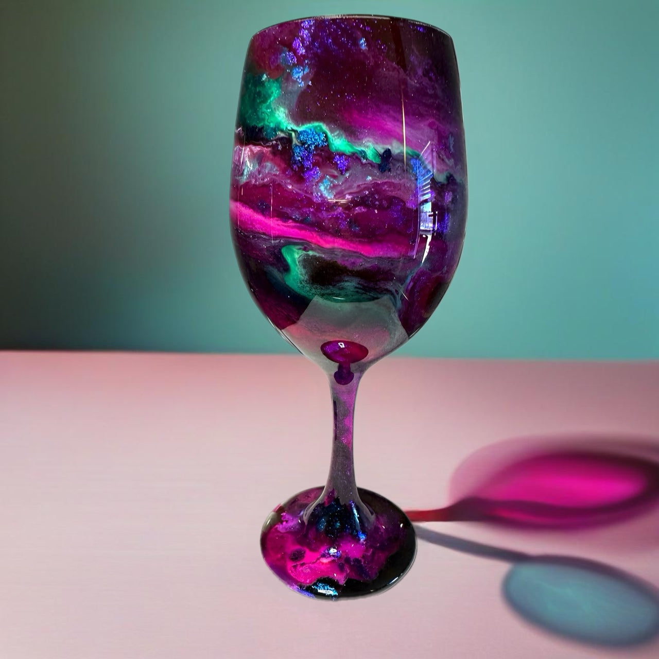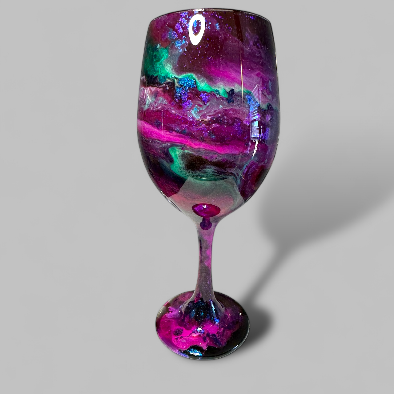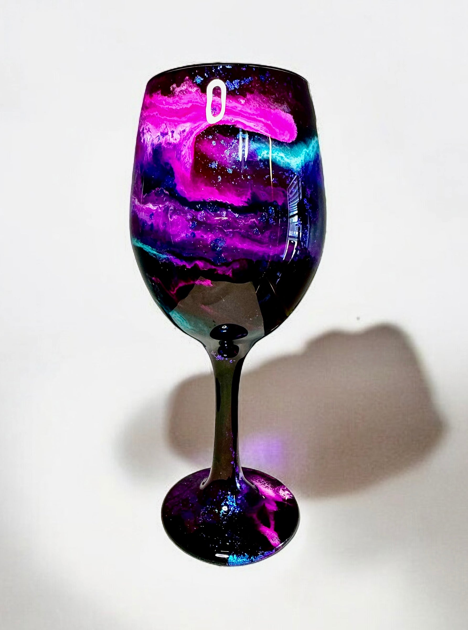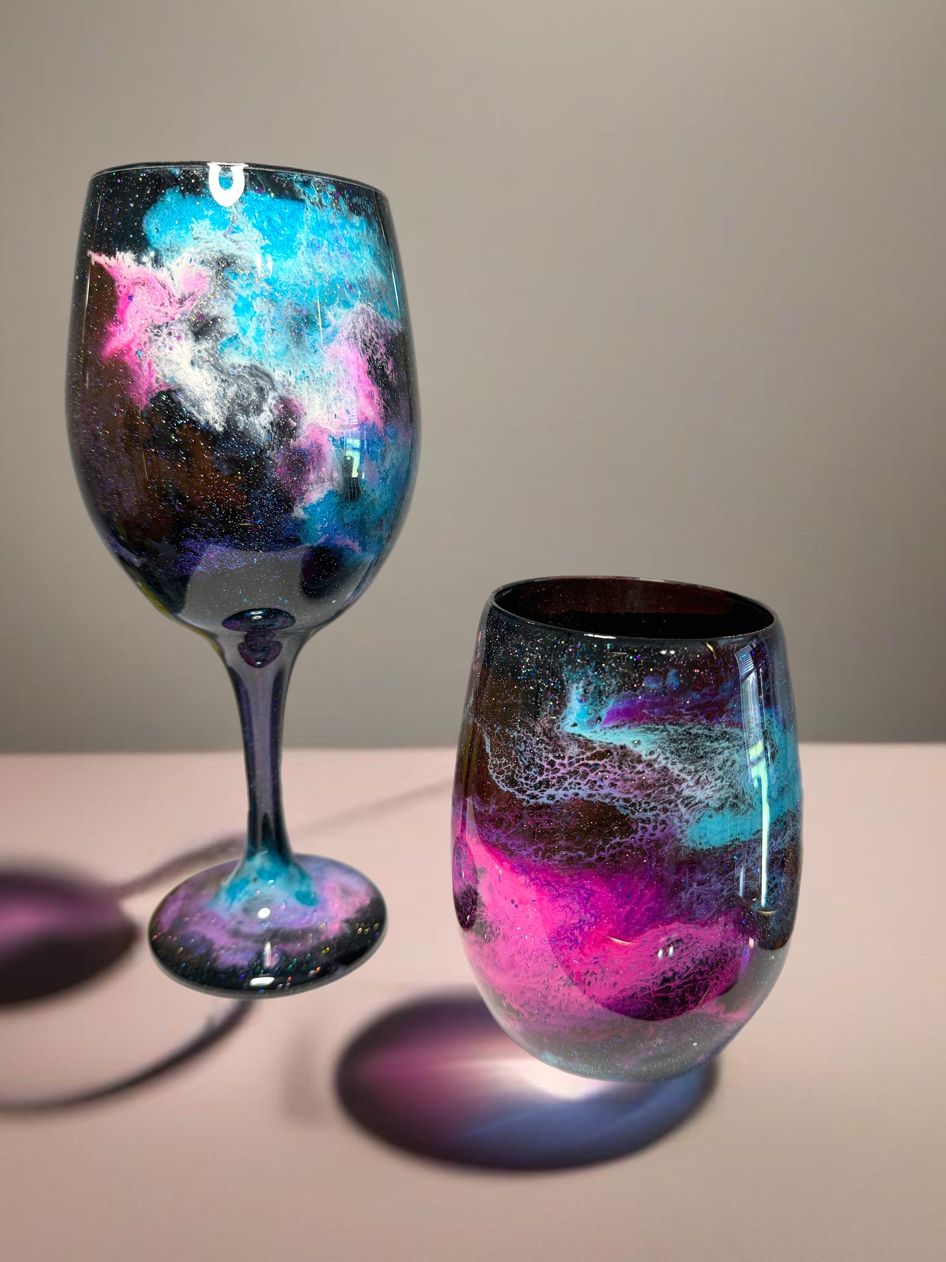 Each glass is individually hand-painted using various alcohol inks, mica or pigment pastes. No two glasses will be exactly alike. Glasses are made to order, so yours will look very similar to the glasses pictured, but indeed one-of-a-kind.
