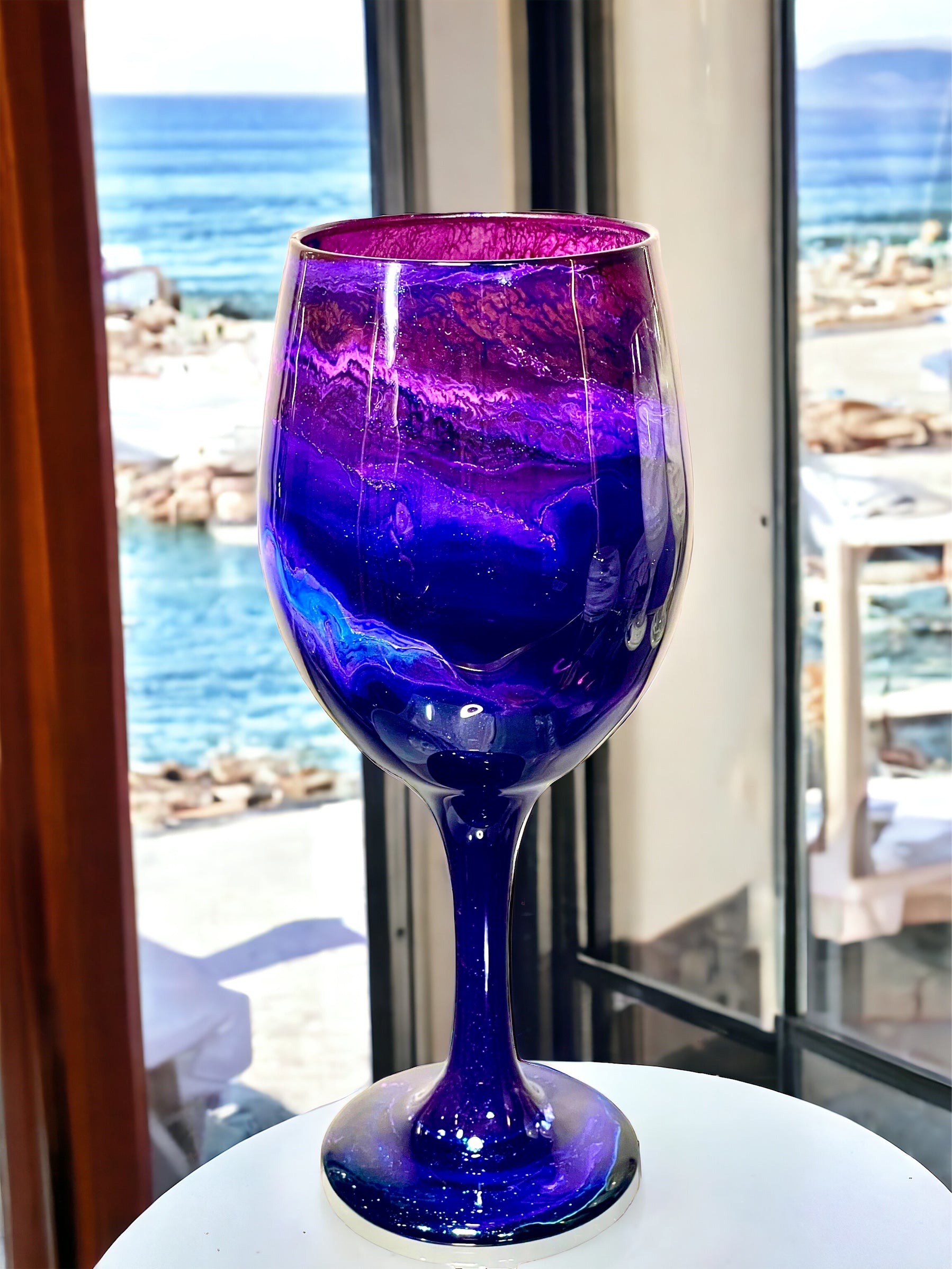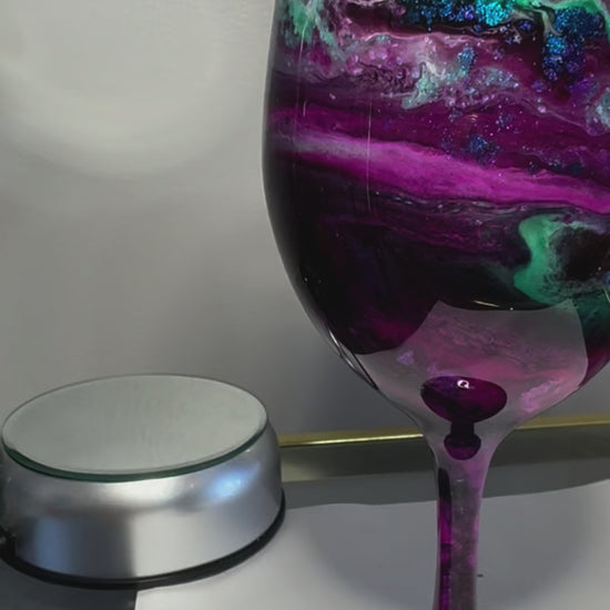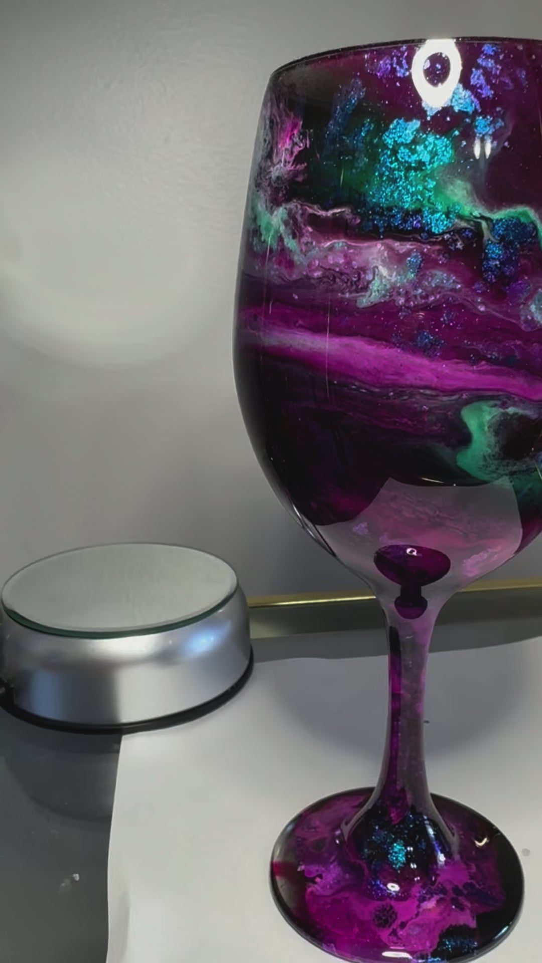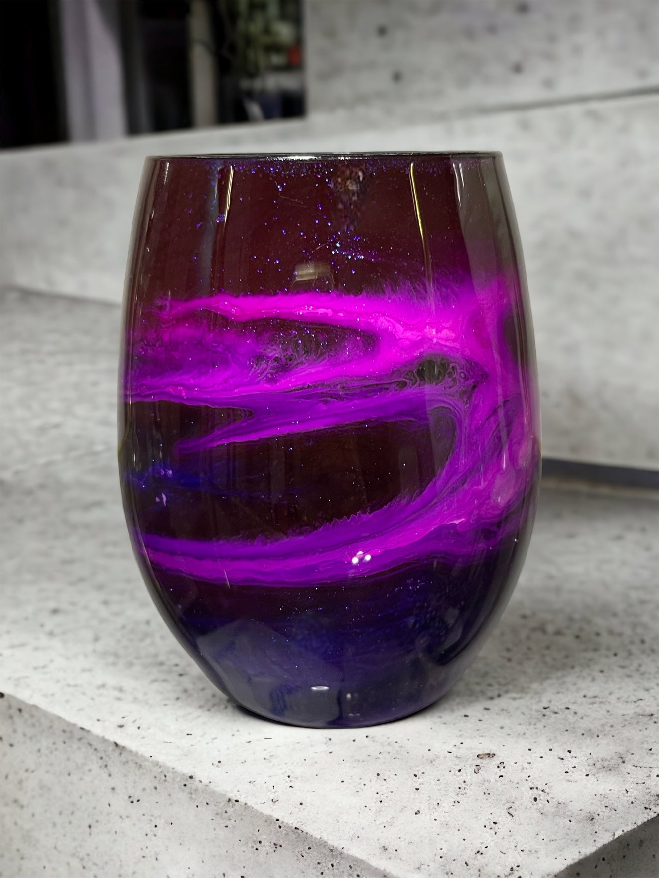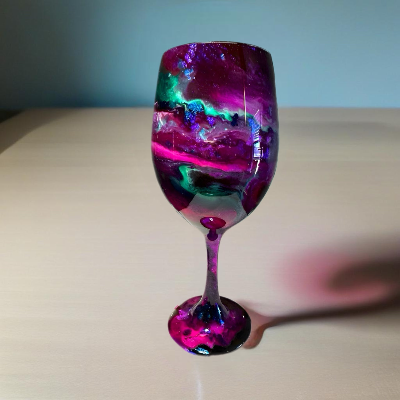 Each glass is individually hand-painted using various alcohol inks, mica or pigment pastes. No two glasses will be exactly alike. Glasses are made to order, so yours will look very similar to the glasses pictured, but indeed one-of-a-kind.