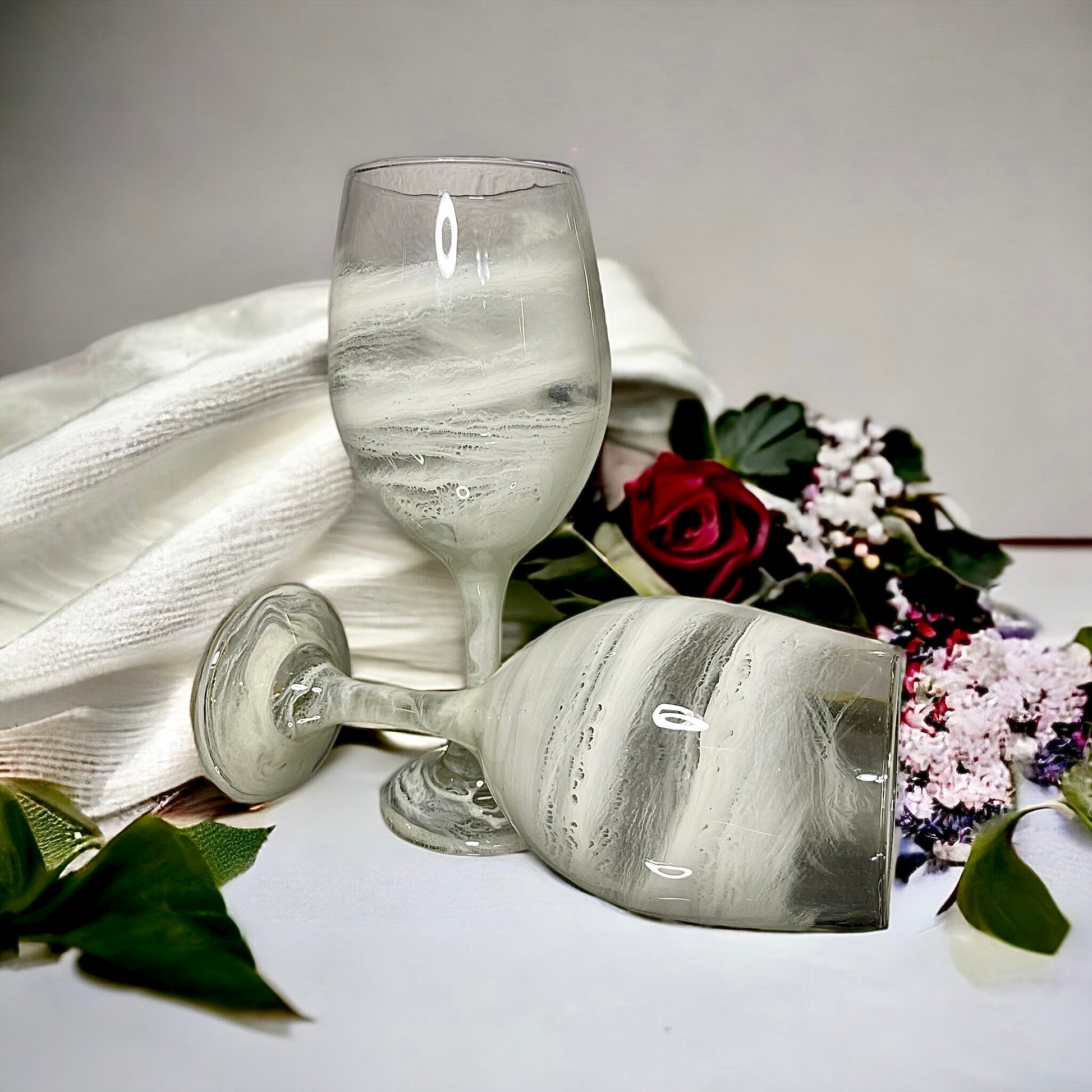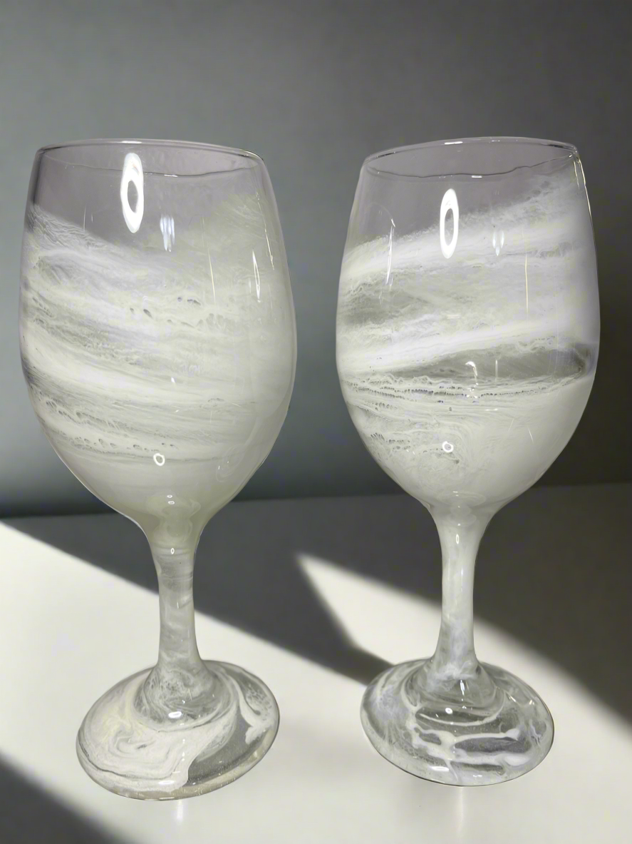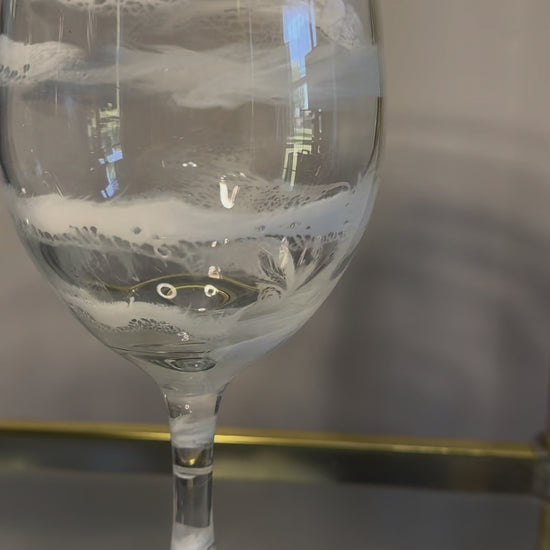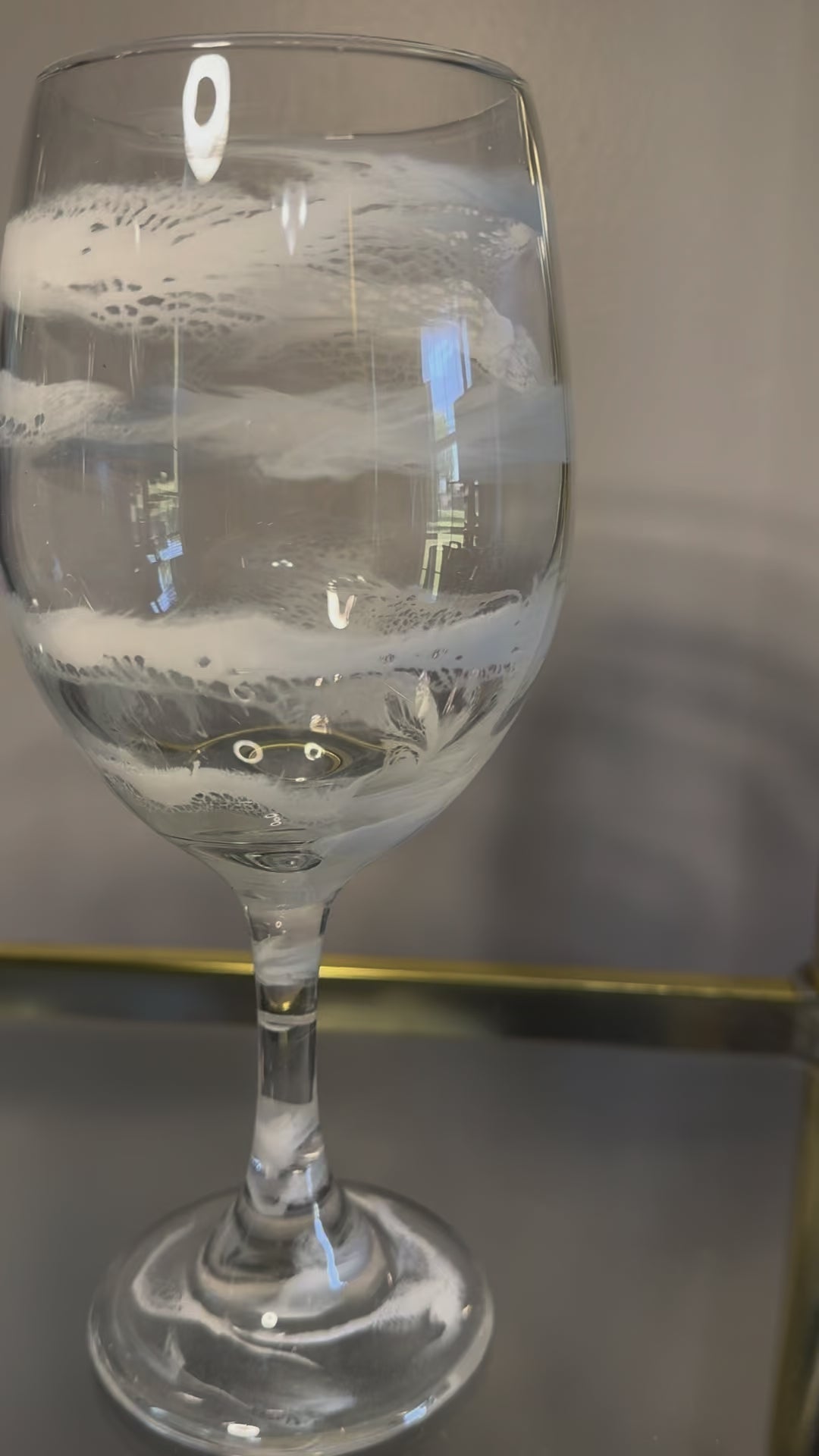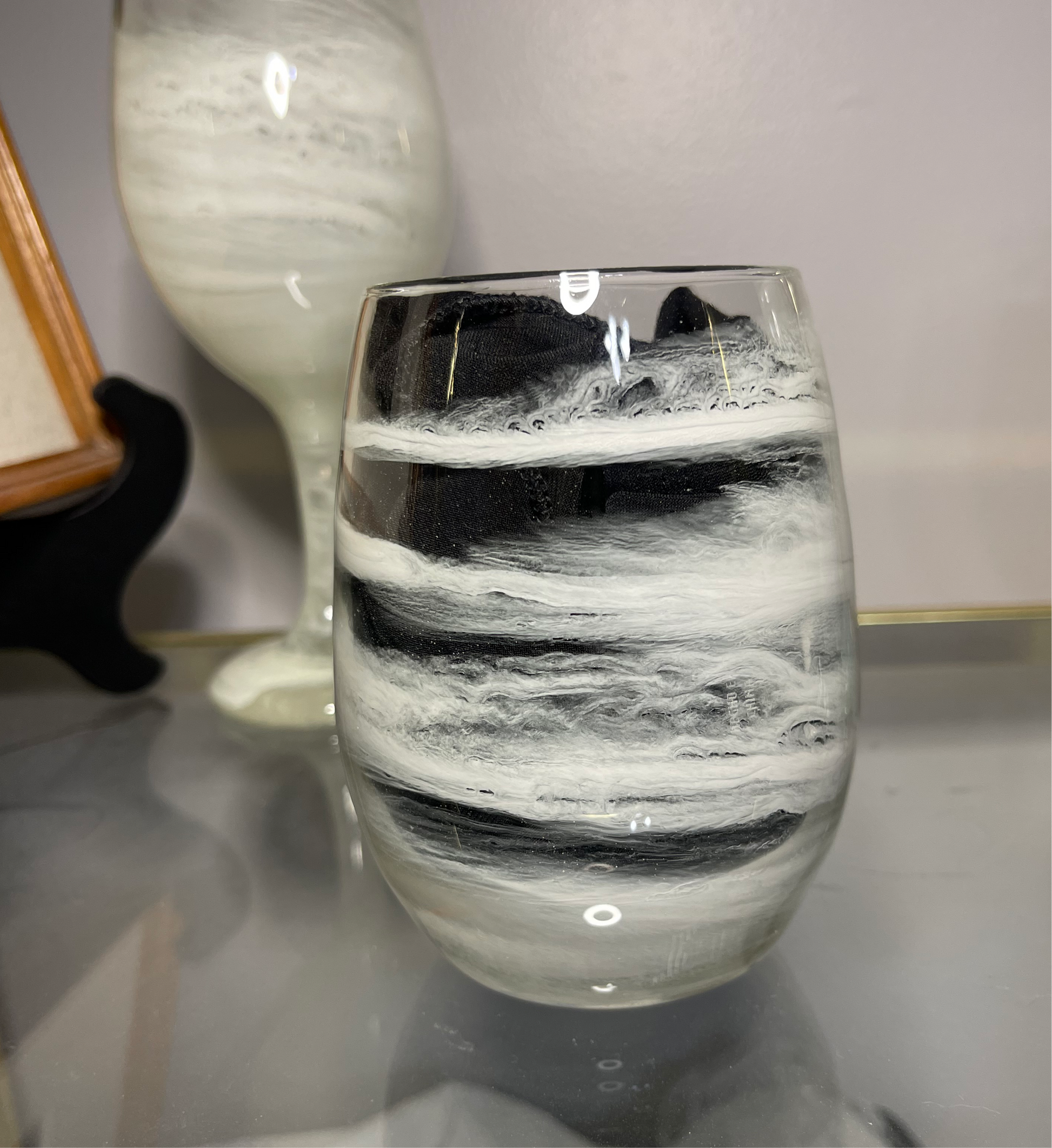Each glass is individually hand-painted using various alcohol inks, mica or pigment pastes. No two glasses will be exactly alike. Glasses are made to order, so yours will look very similar to the glasses pictured, but indeed one-of-a-kind.