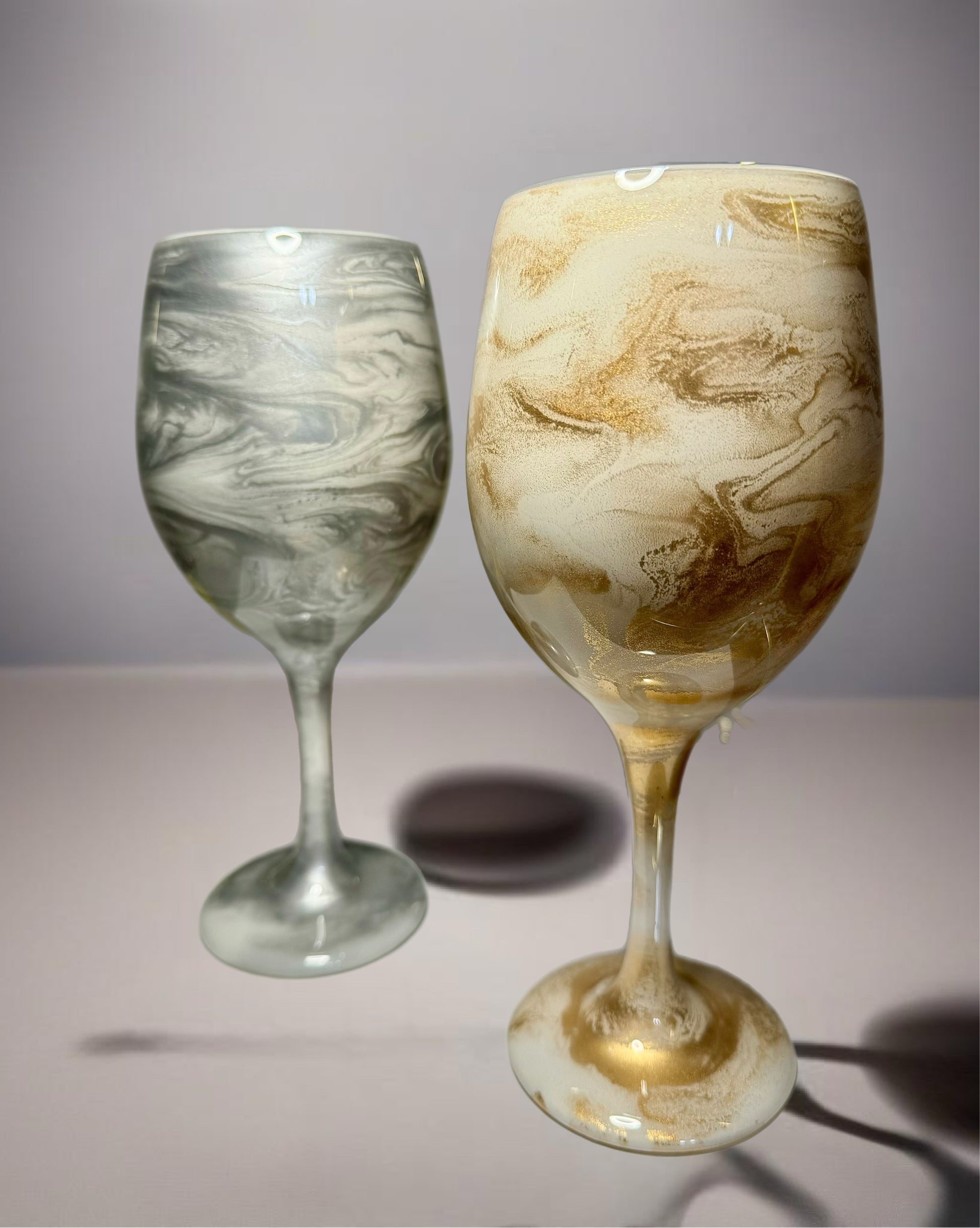 Each glass is individually hand-painted using various alcohol inks, mica or pigment pastes. No two glasses will be exactly alike. Glasses are made to order, so yours will look very similar to the glasses pictured, but indeed one-of-a-kind.