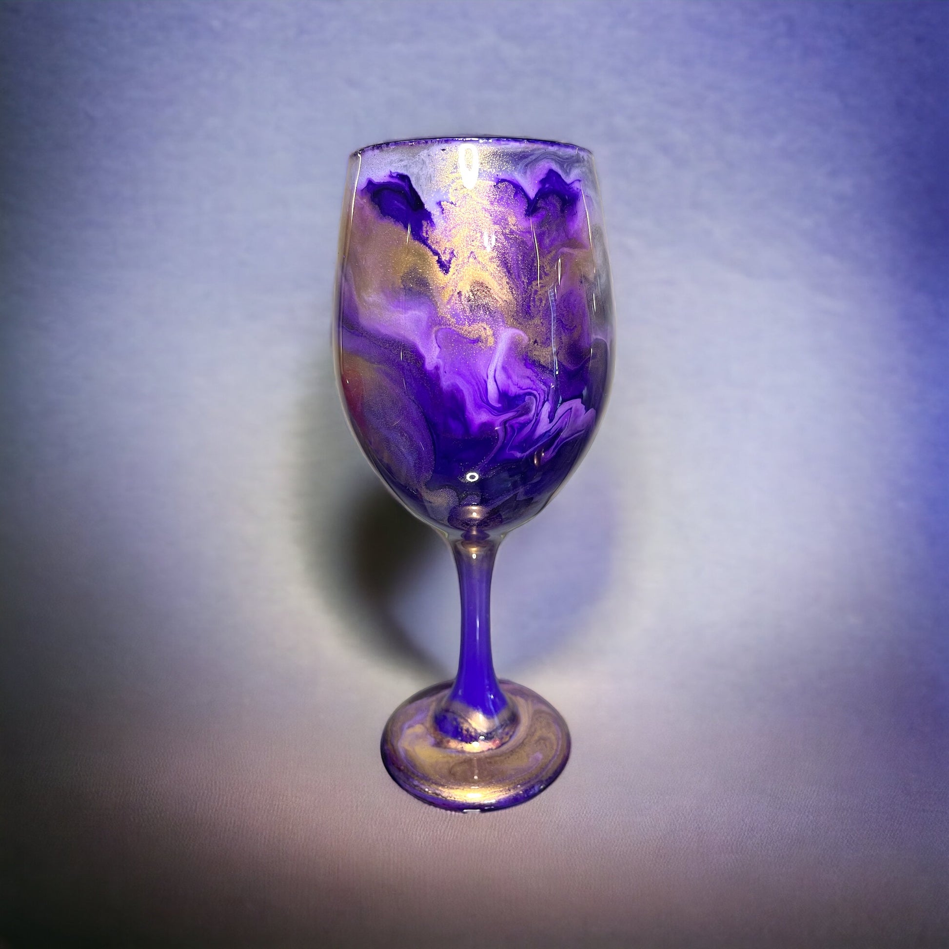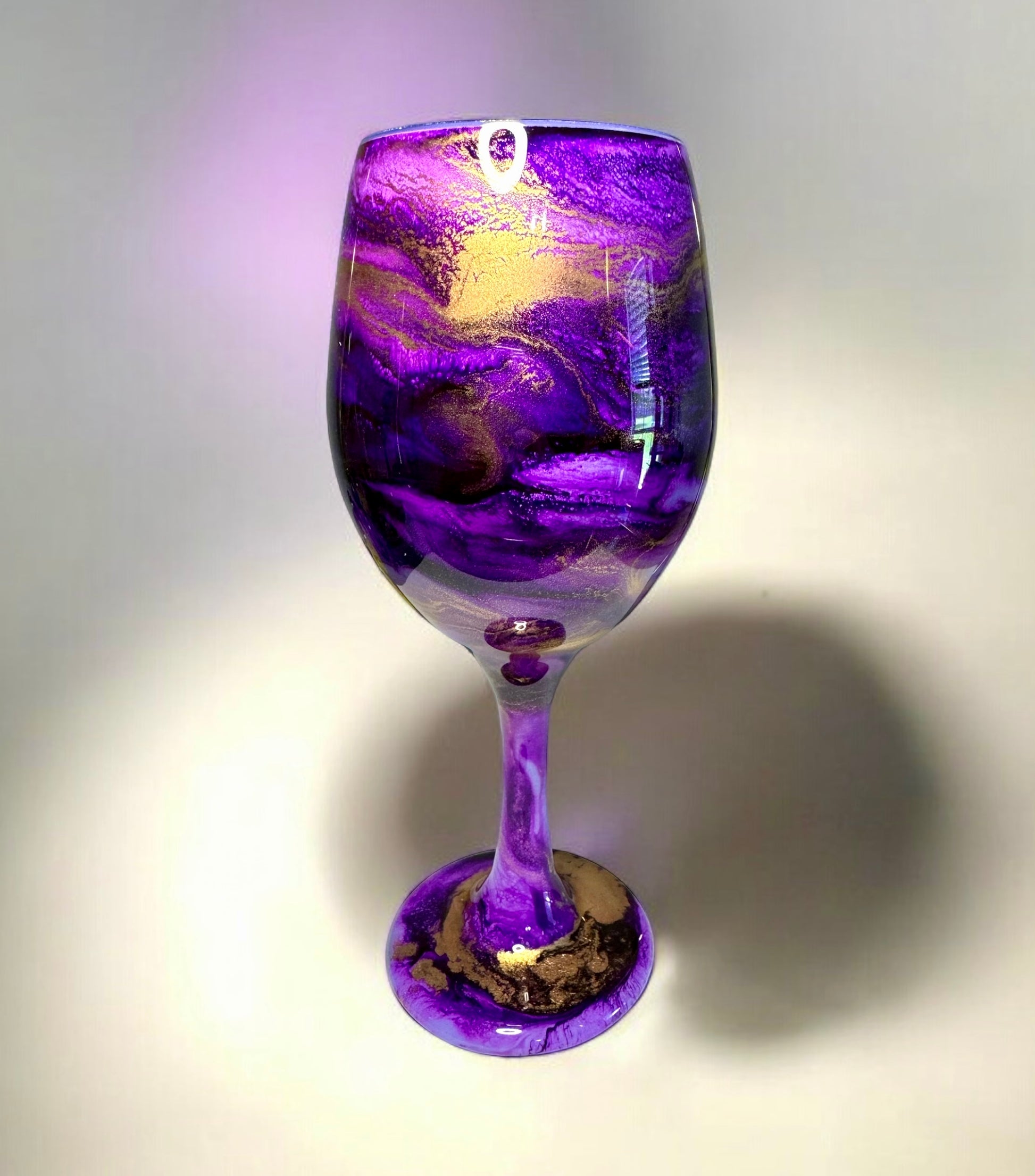 Each glass is individually hand-painted using various alcohol inks, mica or pigment pastes. No two glasses will be exactly alike. Glasses are made to order, so yours will look very similar to the glasses pictured, but indeed one-of-a-kind.