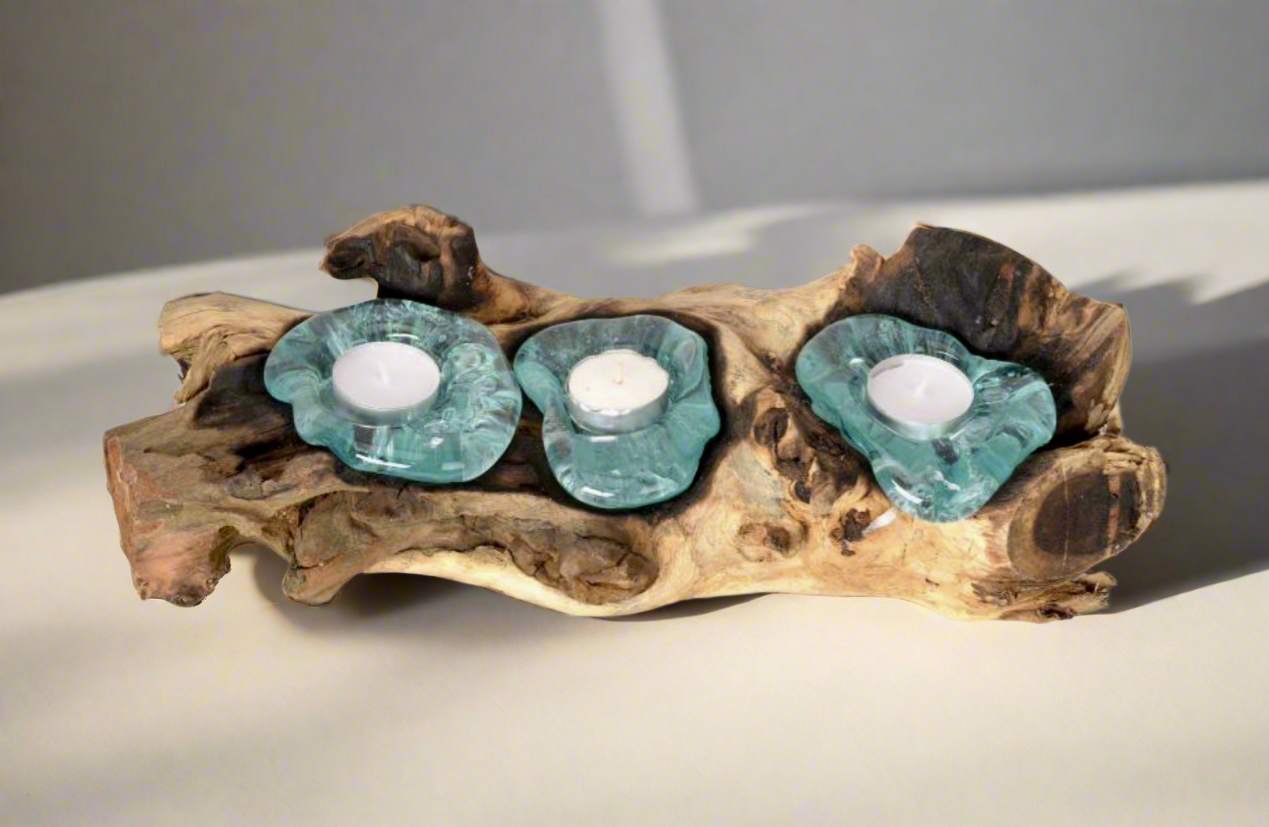 Recycled Molten Glass Triple Tea-light on Balinese Gamal Wood