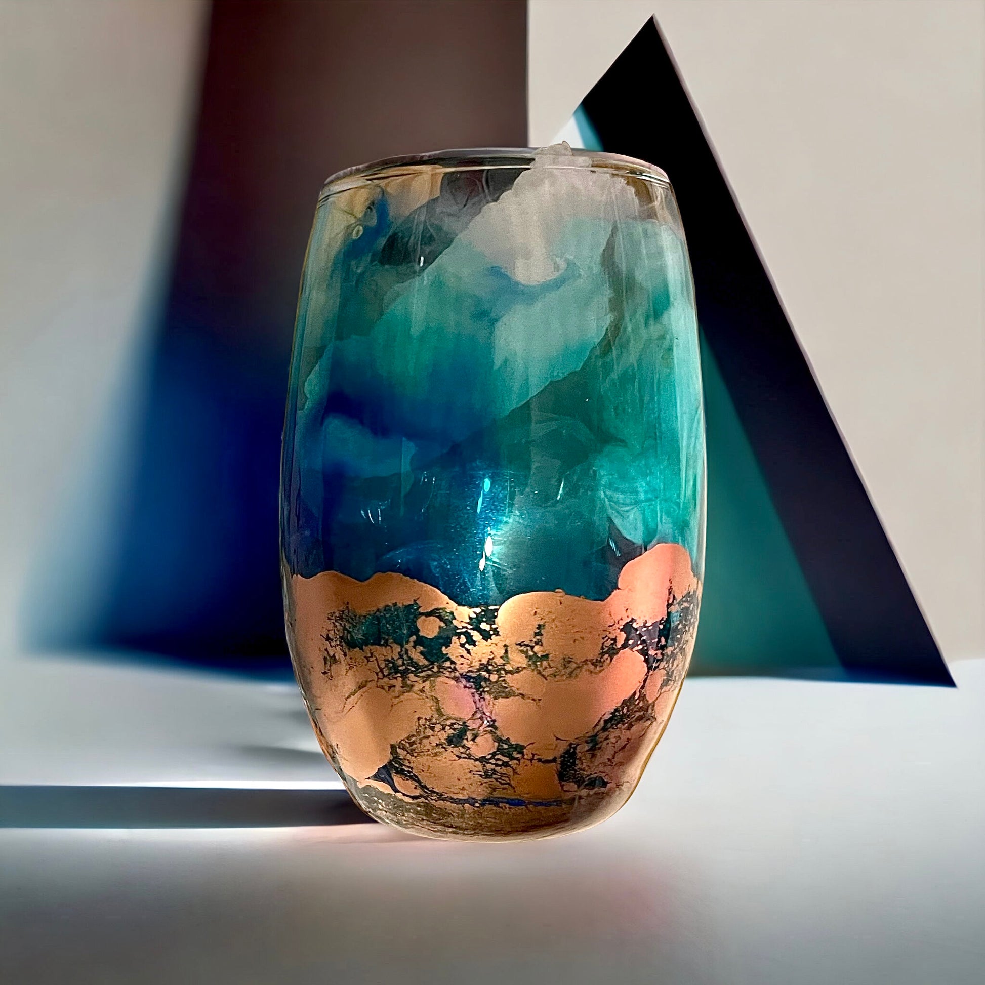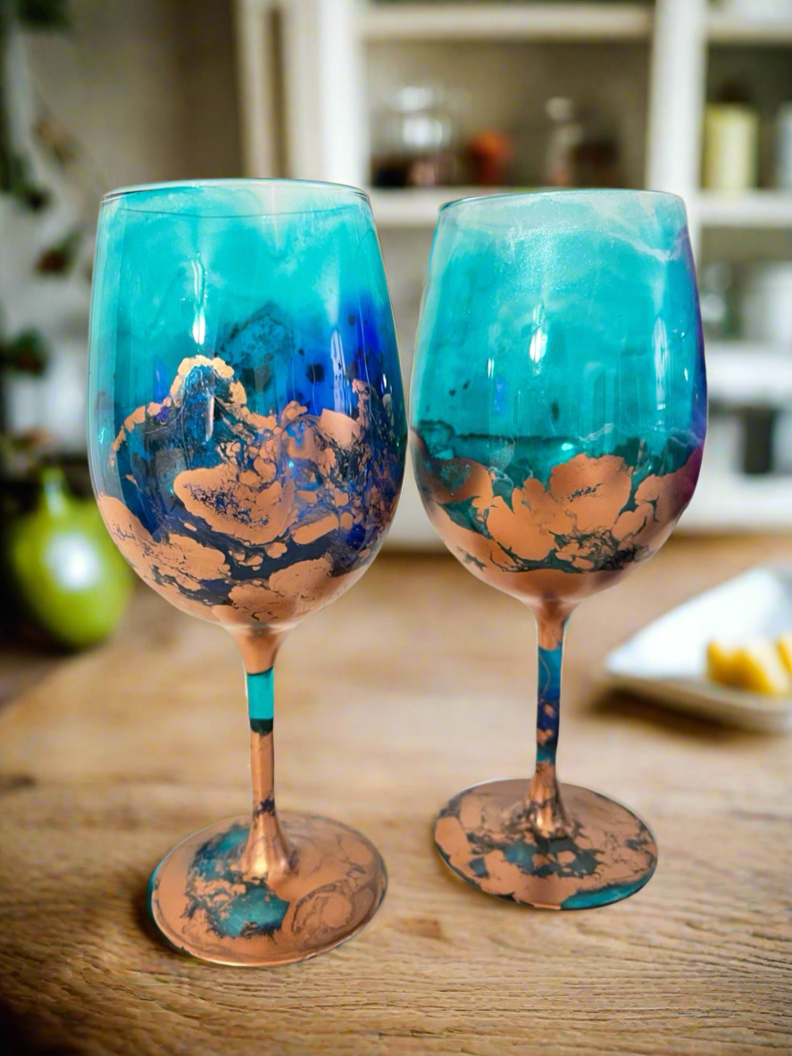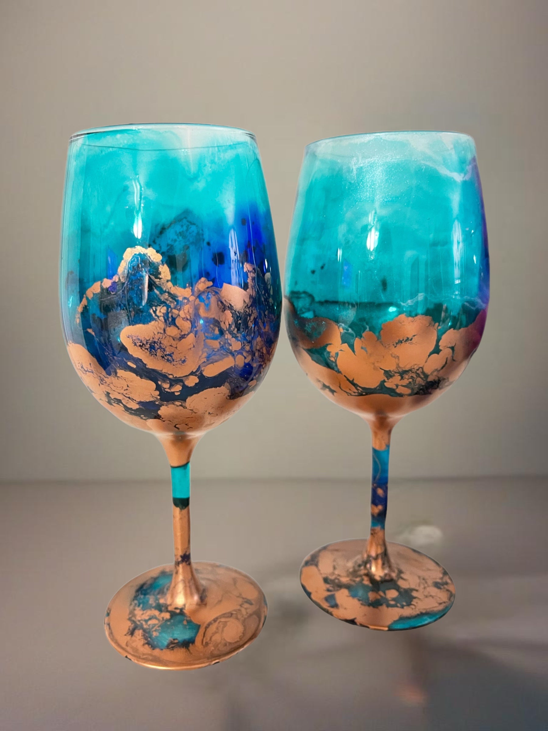 Each glass is individually hand-painted using various alcohol inks, mica or pigment pastes. No two glasses will be exactly alike. Glasses are made to order, so yours will look very similar to the glasses pictured, but indeed one-of-a-kind.