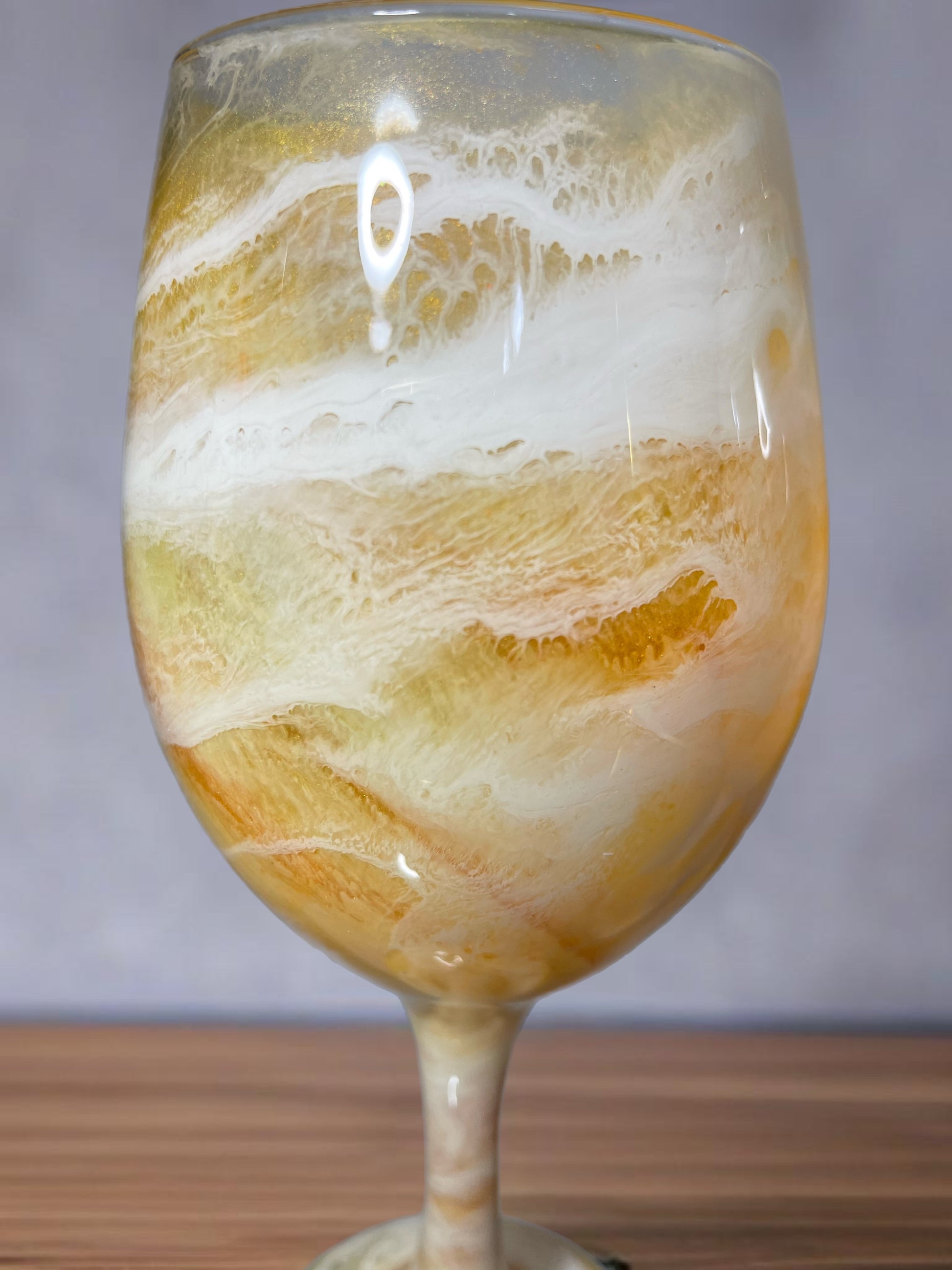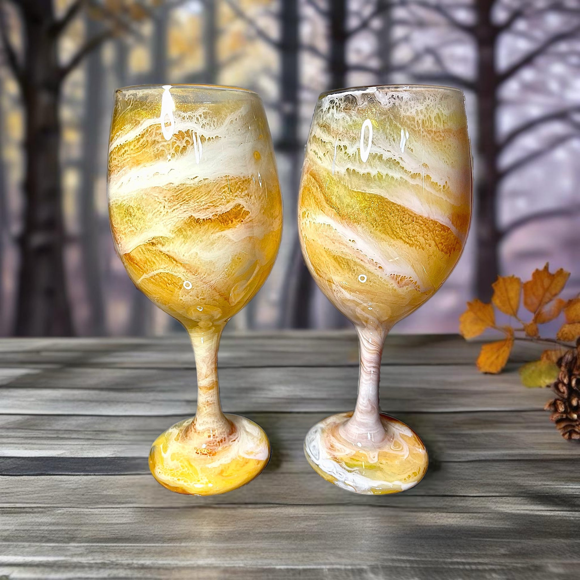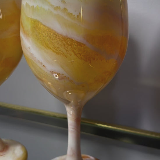 Each glass is individually hand-painted using various alcohol inks, mica or pigment pastes. No two glasses will be exactly alike. Glasses are made to order, so yours will look very similar to the glasses pictured, but indeed one-of-a-kind.