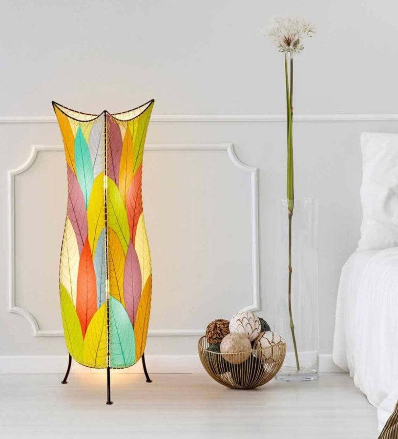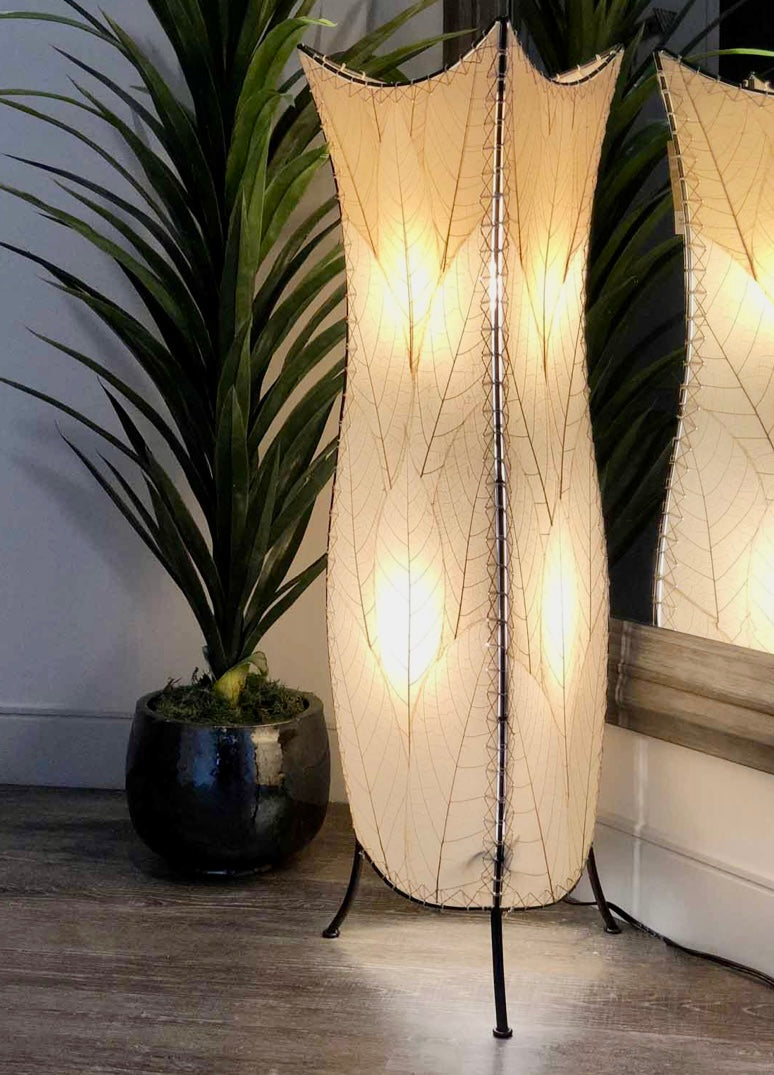 Features fossilized cocoa leaves arranged vertically that are hand placed on a standard UL lamp backing and then laminated using a non-toxic adhesive, creating the three side panels of the lamp. The panels are handstitched onto a powder coated, wrought iron frame to form a curved design. The upper interior of the lamp is finished with additional fossilized cocoa leaves.