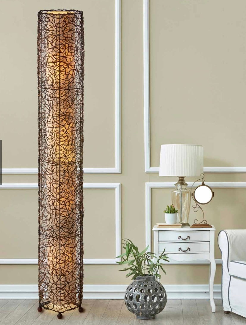 The inner diffuser features banana fiber paper which is adhered using a non-toxic adhesive to a standard UL lamp backing. This mesh is attached to a heavy duty wrought iron frame, powder coated, to ensure the lamps longevity. Light bulbs are accessible with a detachable light rob, that can be pulled through the top of the lamp. This lamp sets on six wooden finials as feet and can be turned on/off with a foot switch.