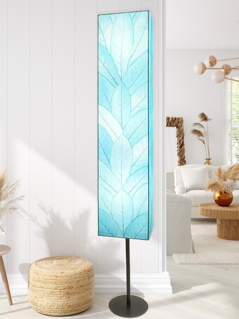 Features fossilized cocoa leaves that are hand-placed on a standard UL lamp backing and then laminated using a non-toxic adhesive, creating each of the four sides of the lamp. The four-foot-tall shade is framed in wrought iron, powder-coated for durability, and sets on top of a two-foot-tall, black, powder-coated, wrought iron base. This base is supported by a solid, padded metal plate to ensure this piece is weighted and sturdy.