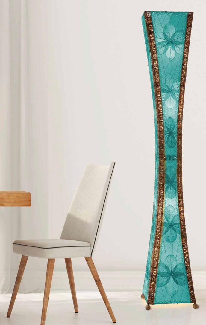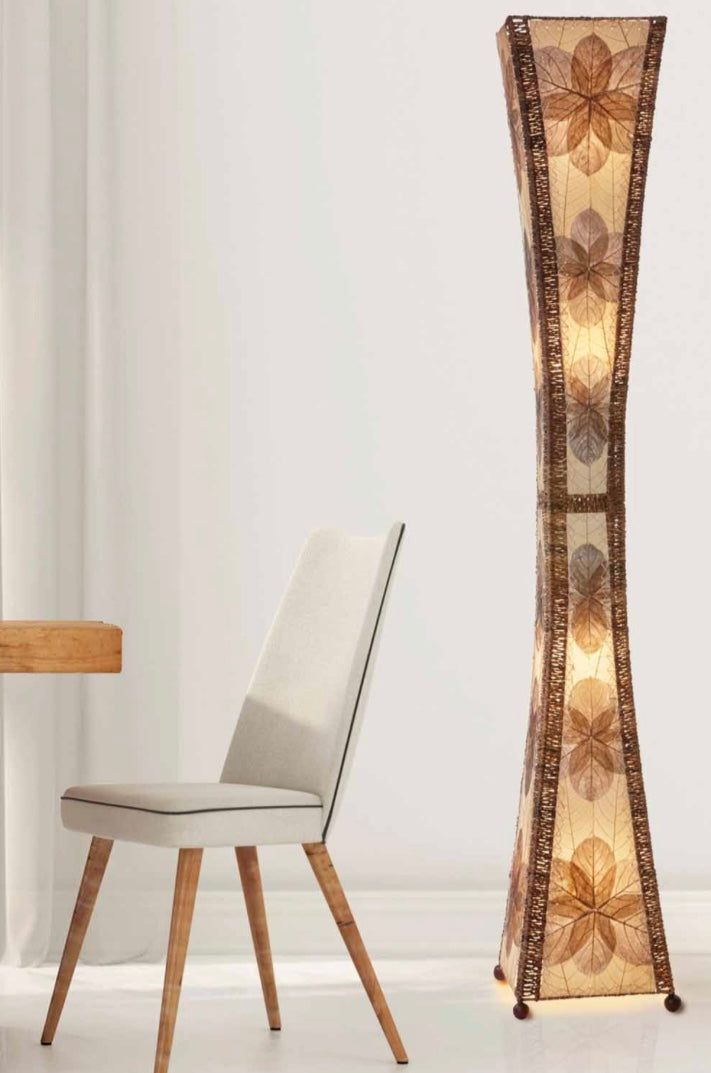 Features fossilized jackfruit leaves that are hand placed on a standard UL lamp backing and then laminated using a non-toxic adhesive, creating eight individual panels used on the lamp. The panels are handstitched onto a powder coated, wrought iron frame to form a traditional Hourglass design. The corners and center of the lamp are accented with a thin abaca rope which is woven around the metal framing. The body of the lamp is set on four wooden finials.
