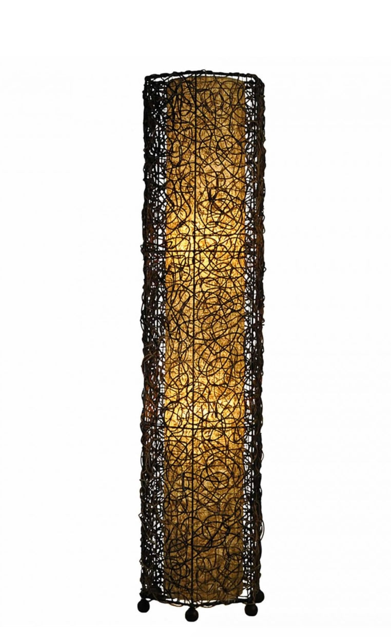The inner diffuser features banana fiber paper which is adhered using a non-toxic adhesive to a standard UL lamp backing. This mesh is attached to a heavy duty wrought iron frame, powder coated, to ensure the lamps longevity. Light bulbs are accessible with a detachable light rob, that can be pulled through the top of the lamp. This lamp sets on six wooden finials as feet and can be turned on/off with a foot switch.
