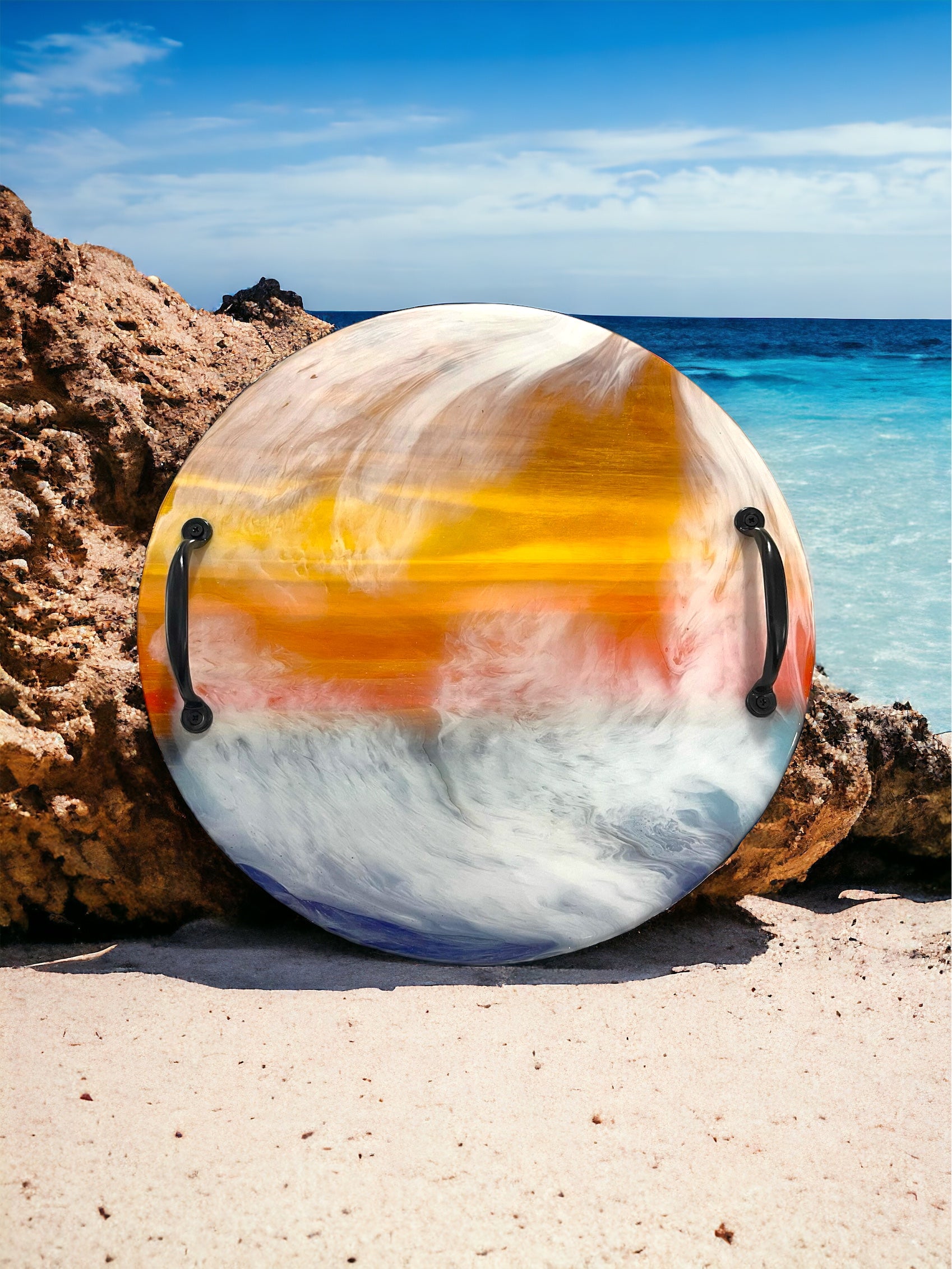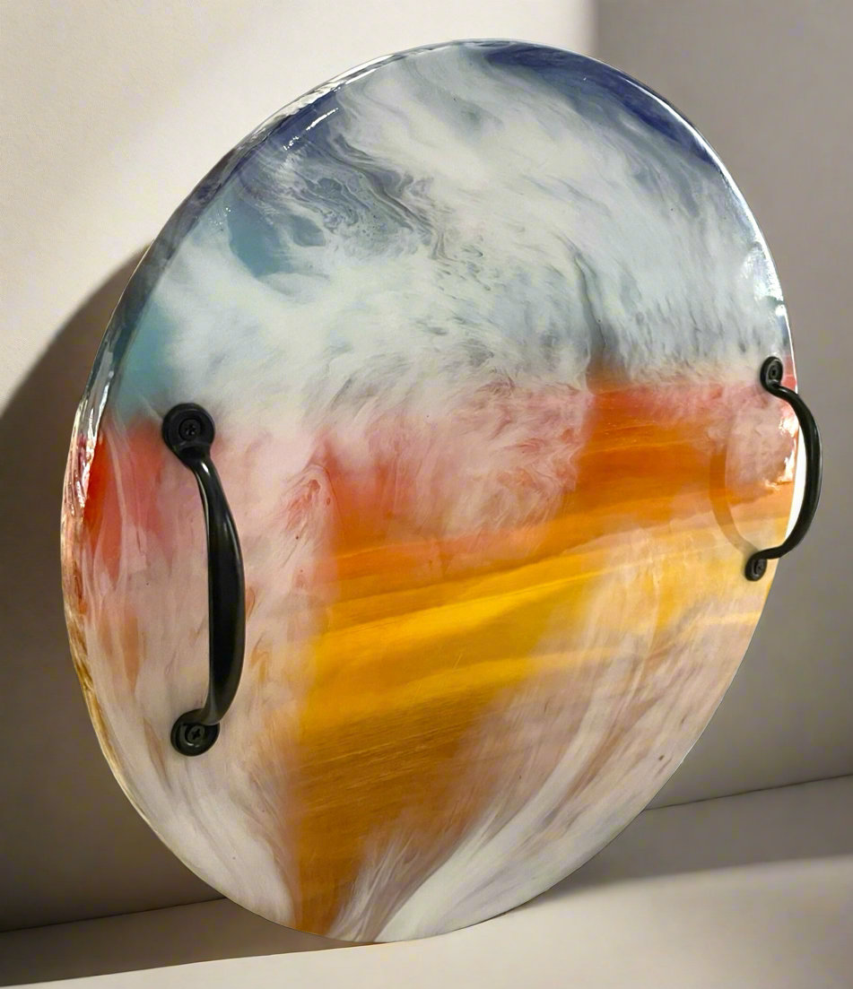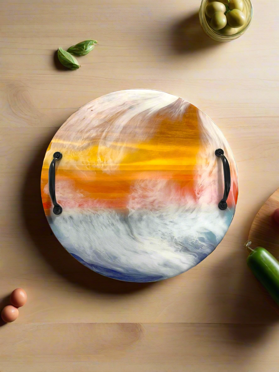 A beautifully crafted wood decorative serving tray/charcuterie board with artistic sunset design. This Serving Tray/Charcuterie Board can be personalized with any name or design. Can be ordered in round or rectangular tray shape. Choose from antique brass or black handles. Each tray includes rubber feet so that your board will not scratch surfaces.