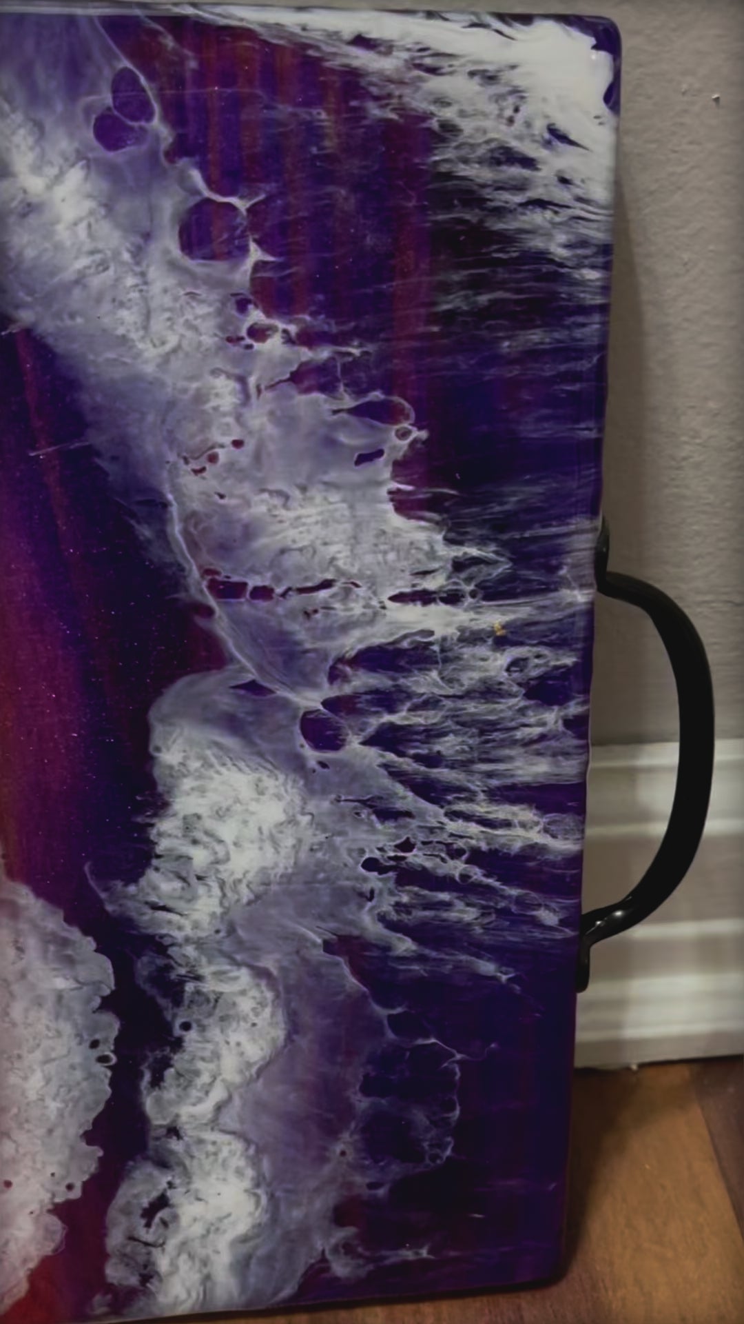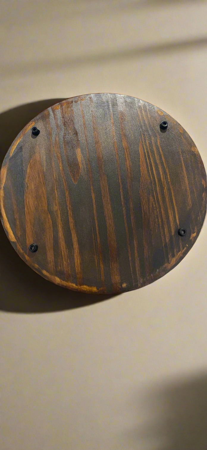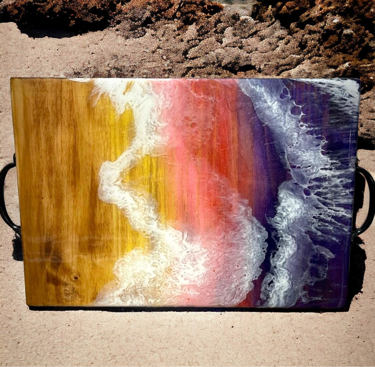 A beautifully crafted wood decorative serving tray/charcuterie board with artistic sunset design. This Serving Tray/Charcuterie Board can be personalized with any name or design. Can be ordered in round or rectangular tray shape. Choose from antique brass or black handles. Each tray includes rubber feet so that your board will not scratch surfaces.