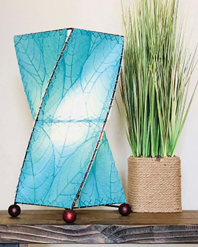 The Twist Series takes a classic cubed design and literally adds a twist. Each side panel consists of broad, vertically placed cocoa leaves and rotates as it guides your eyes up the lamp from bottom to top.