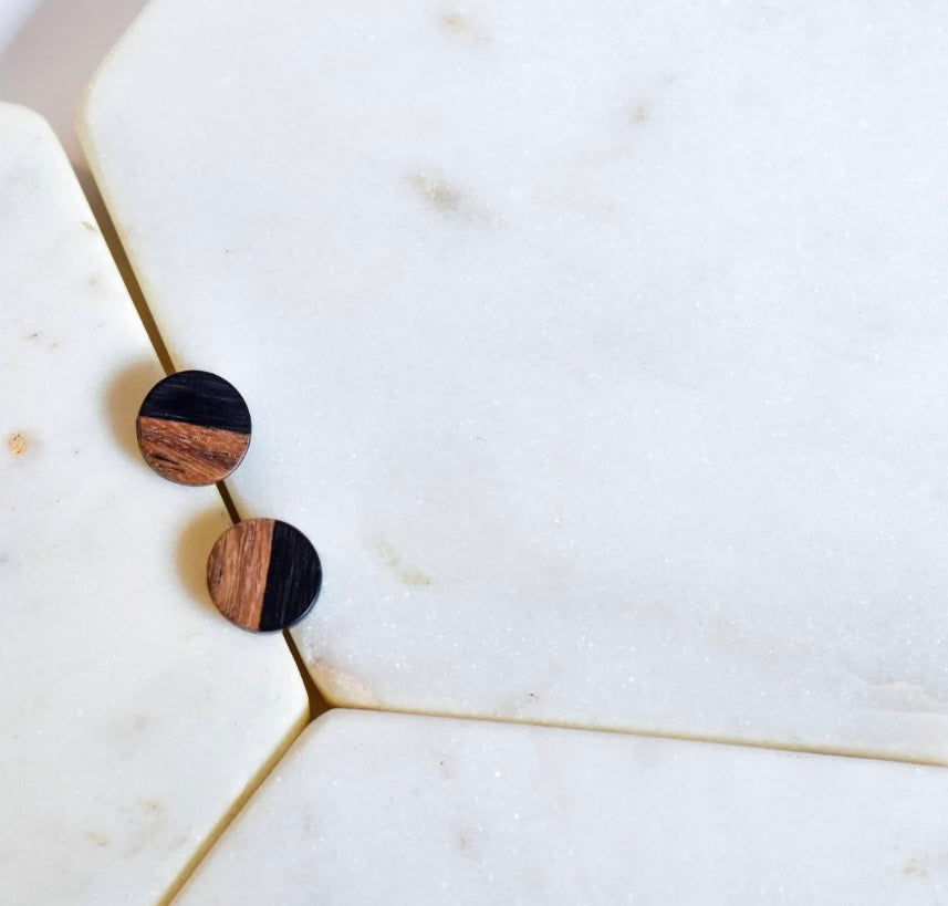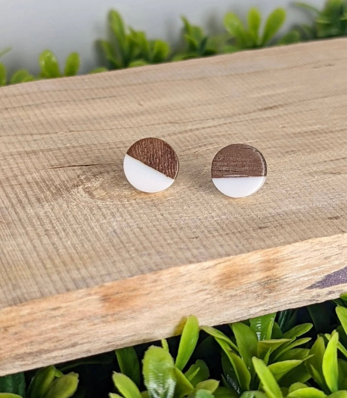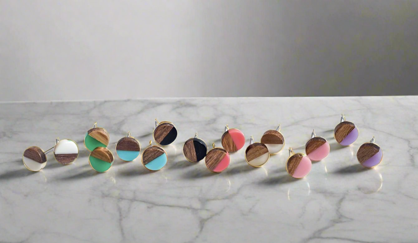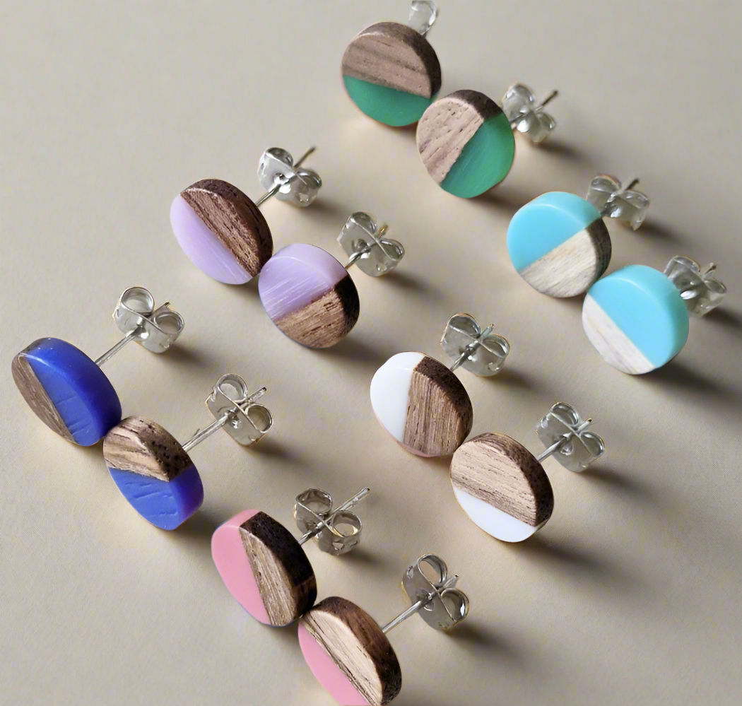 Wood and resin stud earrings. Stainless Steel Pins. 10mm diameter Add some natural charm to your ensemble with these Wood and Resin Stud Earrings! Featuring unique designs made from resin and wood, these earrings add an earthy touch to any outfit. Made with stainless steel pins, they are durable and comfortable to wear. Perfect for any occasion, these 10mm diameter earrings are a must-have for your jewelry collection.
