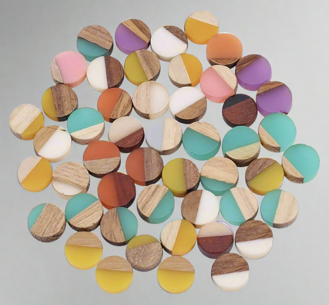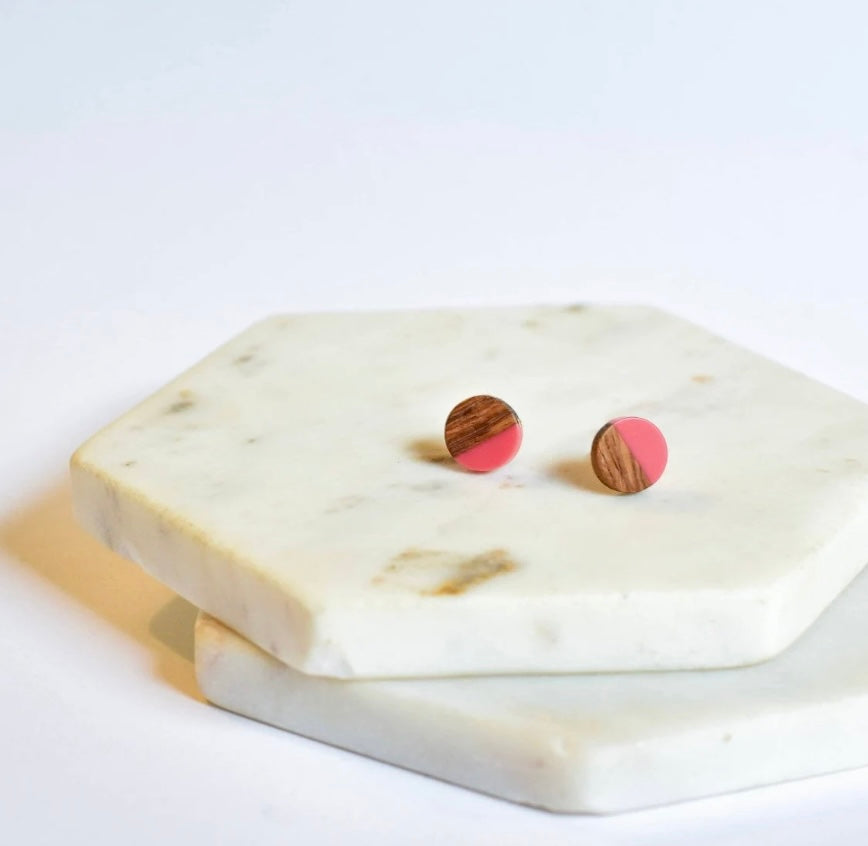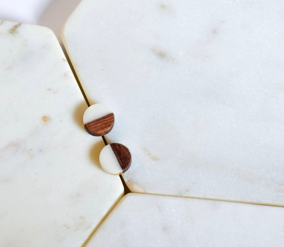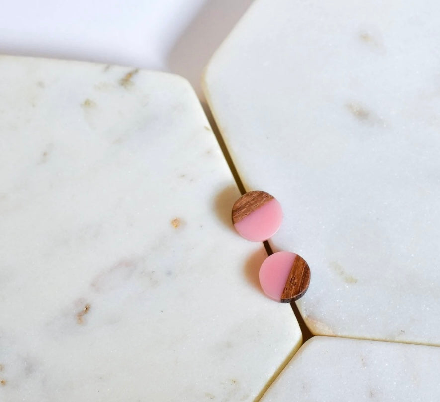 Wood and resin stud earrings. Stainless Steel Pins. 10mm diameter Add some natural charm to your ensemble with these Wood and Resin Stud Earrings! Featuring unique designs made from resin and wood, these earrings add an earthy touch to any outfit. Made with stainless steel pins, they are durable and comfortable to wear. Perfect for any occasion, these 10mm diameter earrings are a must-have for your jewelry collection.